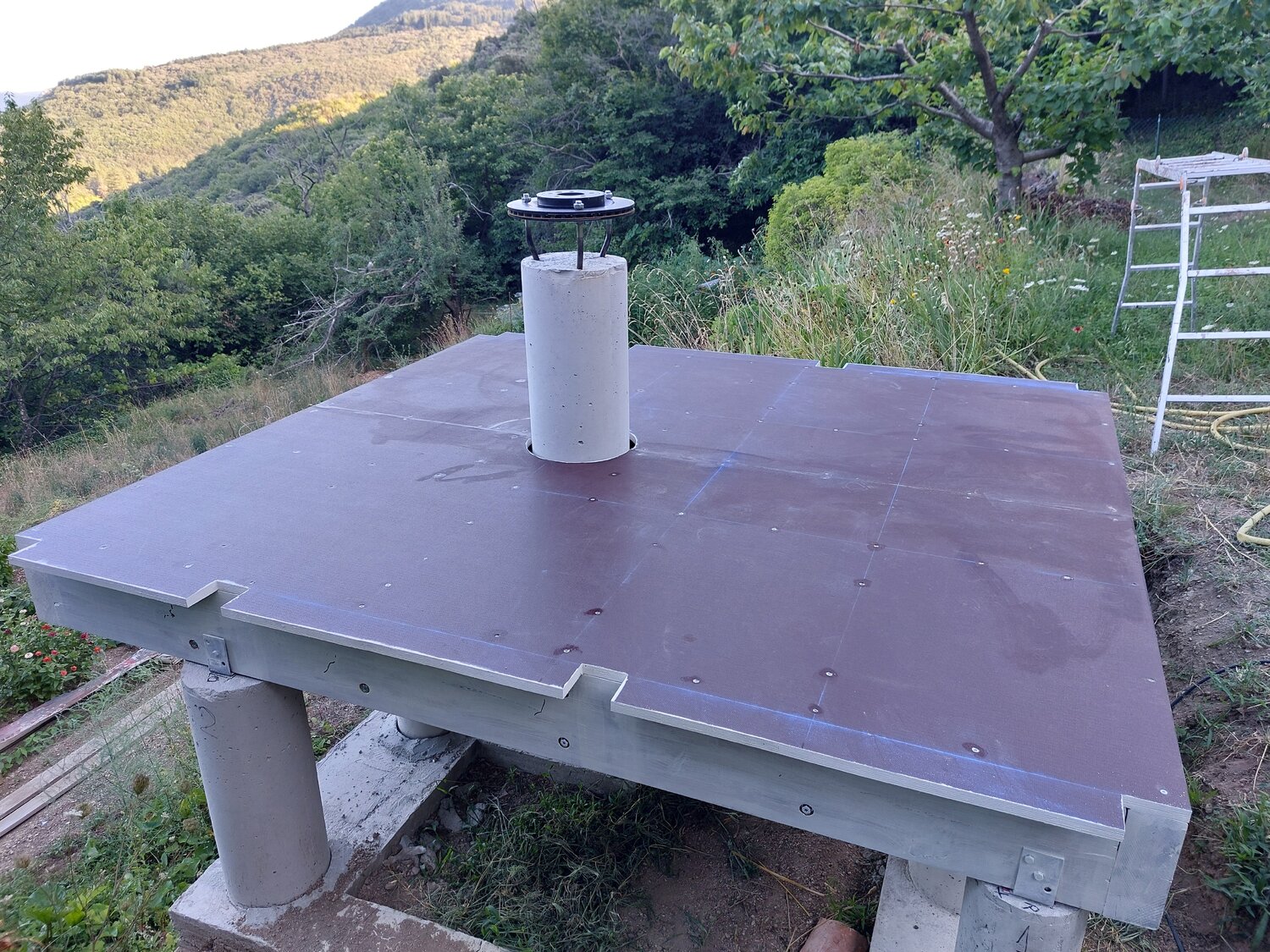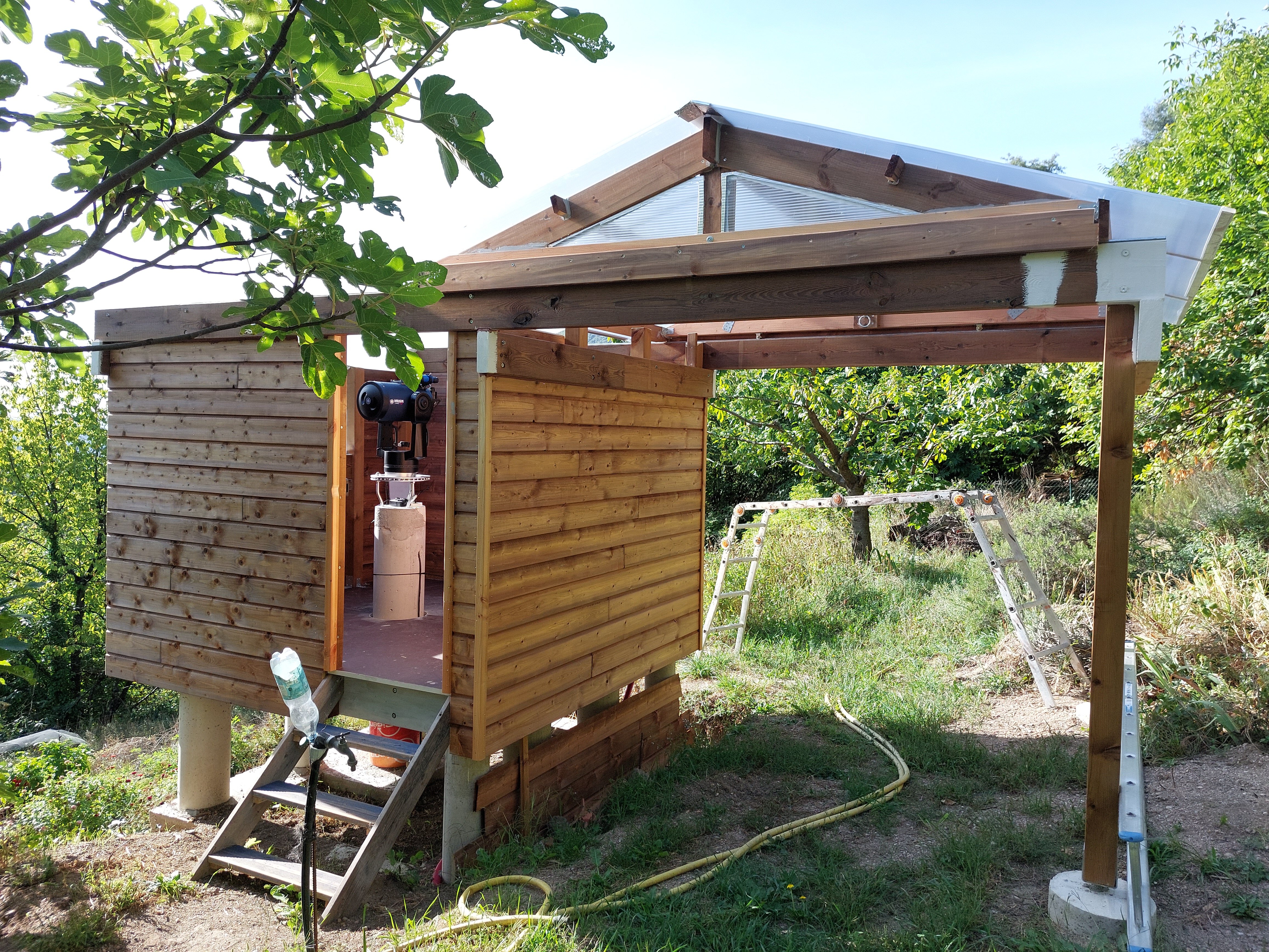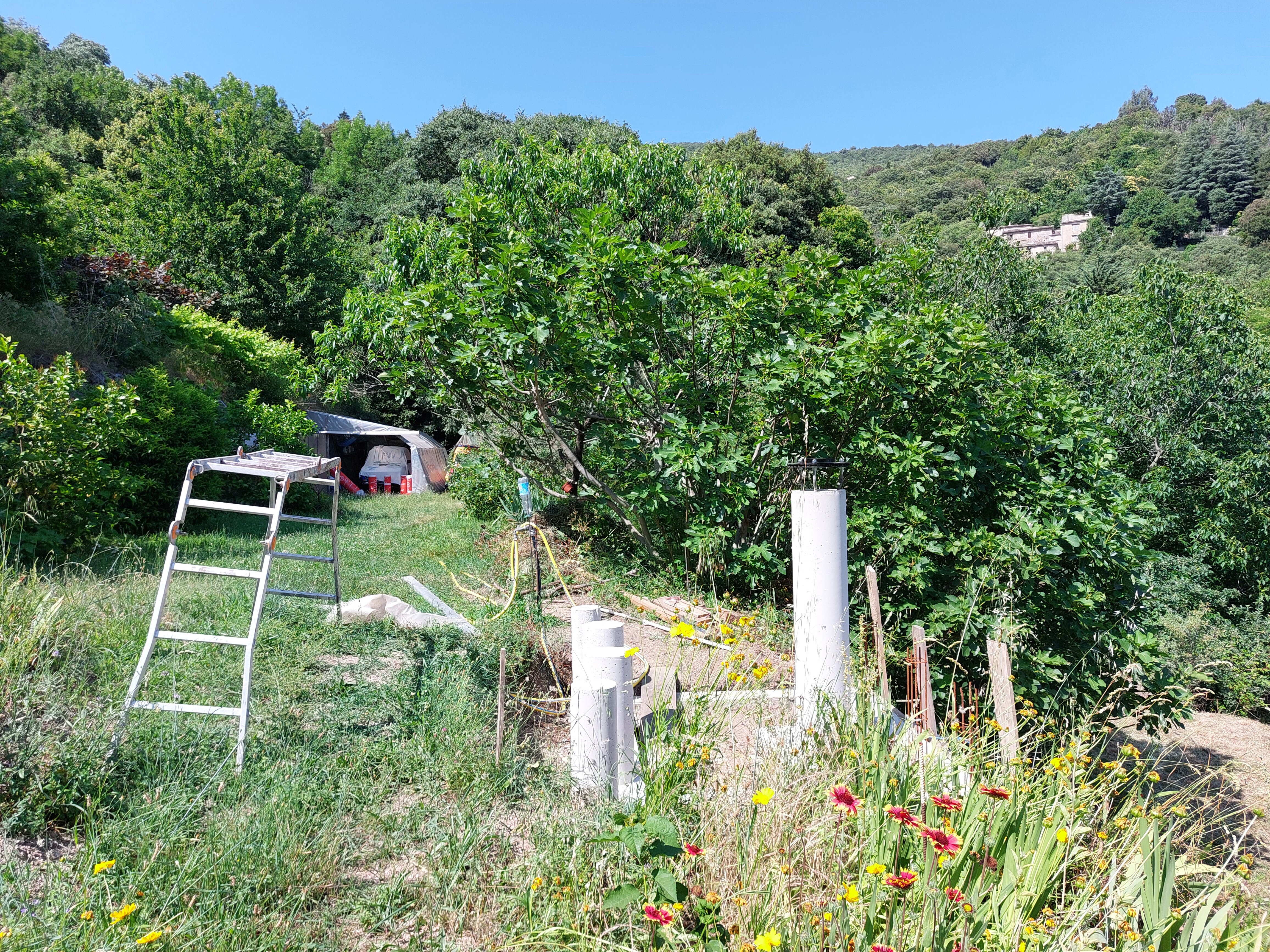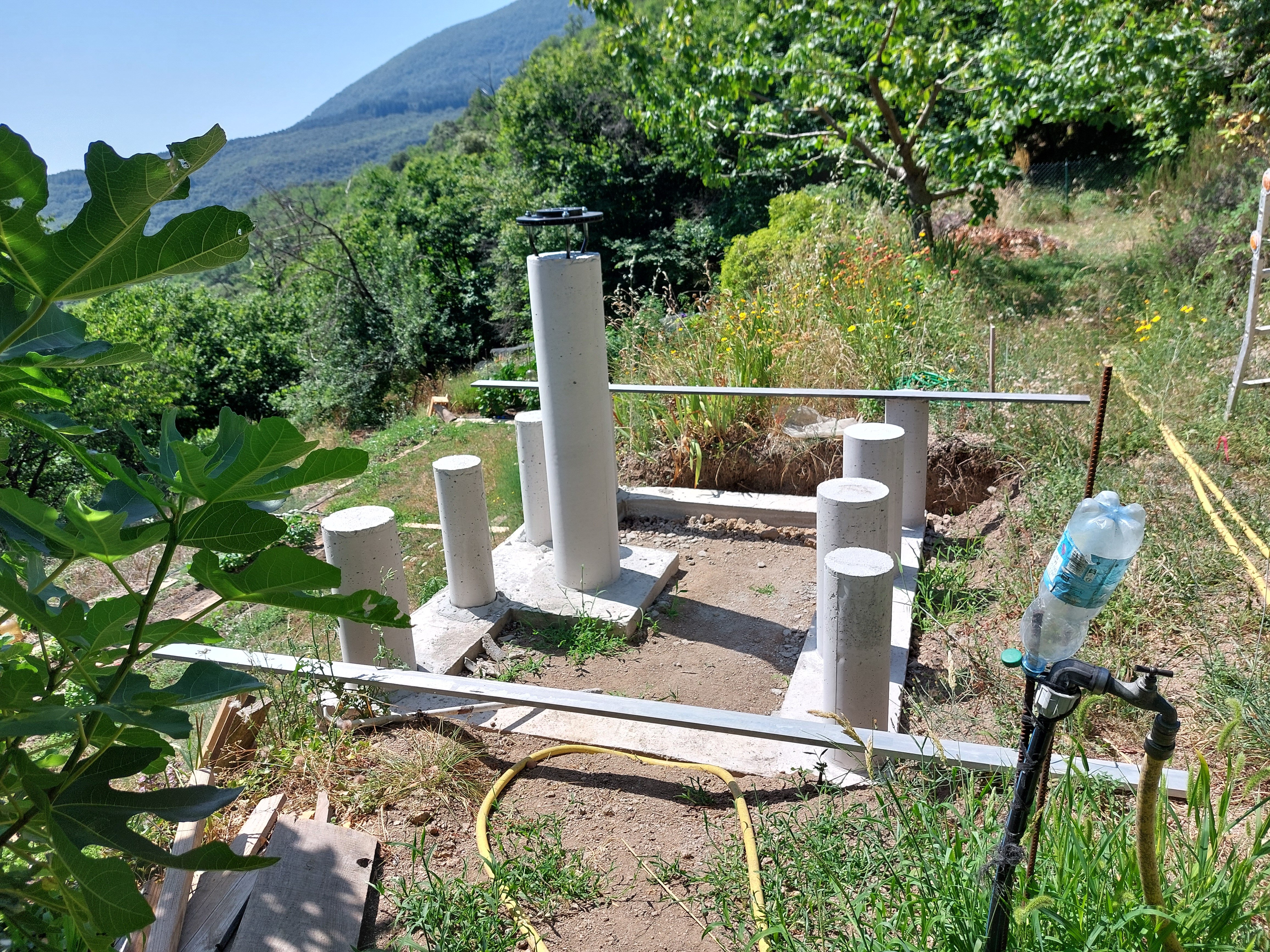 Ton idée au départ m'a séduit, mais j'ai un autre impératif don je n'ai point parlé : les deux traverses qui supportent le poids du toit ouvert passe au dessus d'un chemin d’accès (sur dernière photo là ou il y a l’échelle) à une partie importante de mon terrain, je dois pouvoir passer dessous! Minimum 2m10 même avec des parois de 1,75m je vais devoir excavé le passage de plus de 40cm, terrain en pente... C'est pourquoi j'avais envisagé le dôme... Et qu'une partie de l'abri sera au -dessus du vide (On voit aussi sur les photos les plots ne sont pas symétrique à la colonne) pour laisser le passage.... C'est bien d'être dans une zone de réserve de ciel étoilée : Parc national des Cévennes, mais le terrain en bancels (terrasses) plus ou moins étroites, vallée profondent rendent l’implantation d'un abri difficile. -