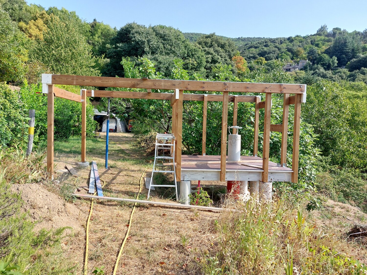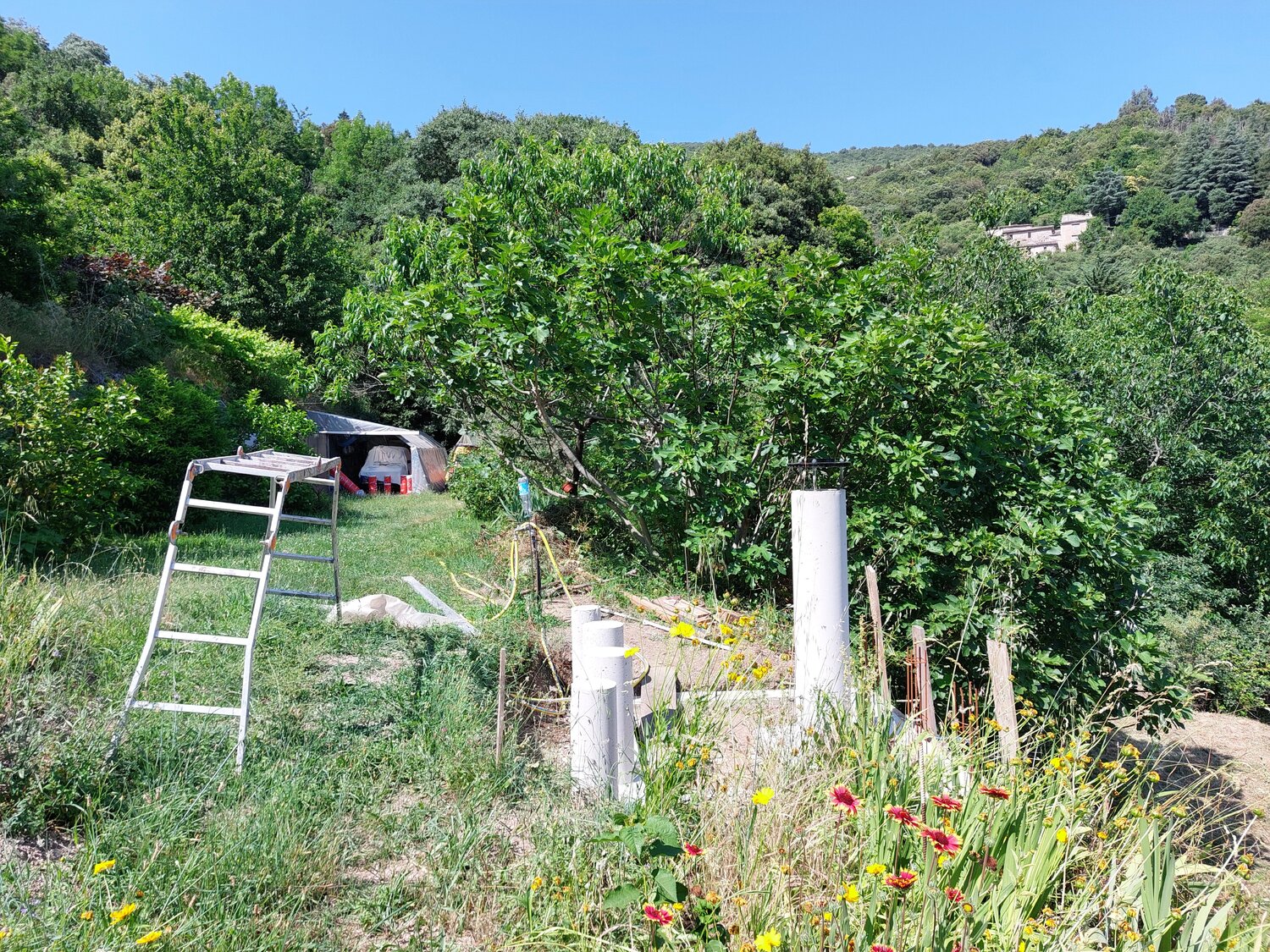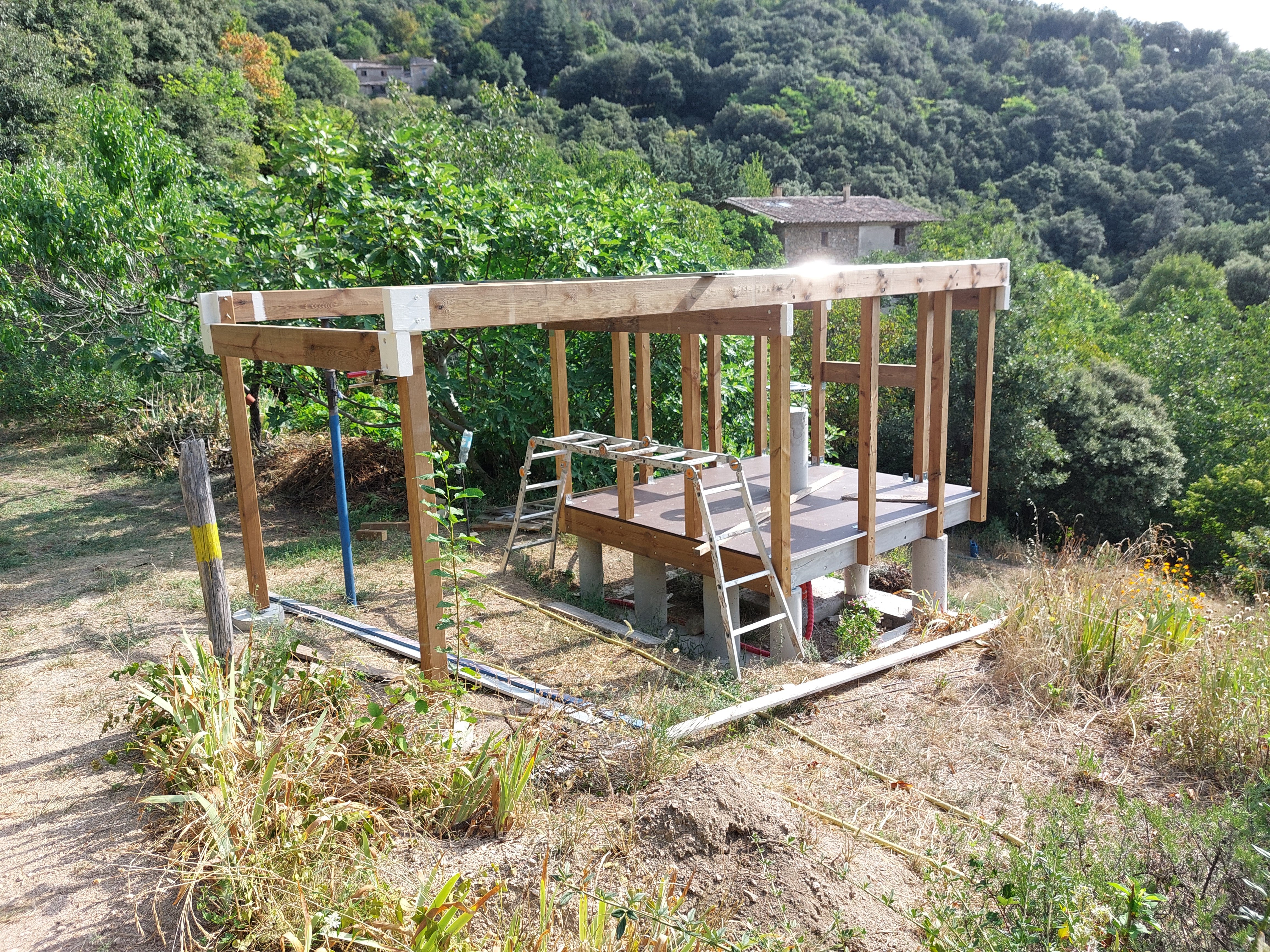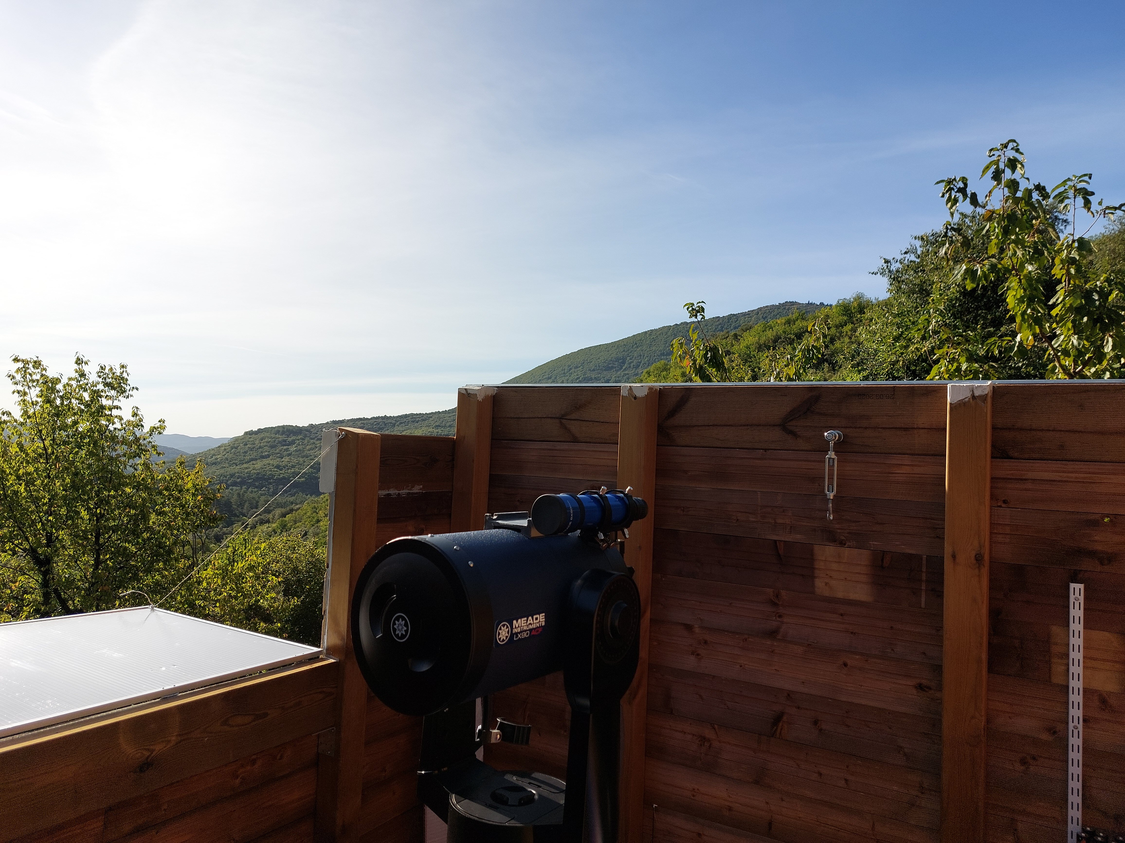 Ton idée au départ m'a séduit, mais j'ai un autre impératif don je n'ai point parlé : les deux traverses qui supportent le poids du toit ouvert passe au dessus d'un chemin d’accès (sur dernière photo là ou il y a l’échelle) à une partie importante de mon terrain, je dois pouvoir passer dessous! Minimum 2m10 même avec des parois de 1,75m je vais devoir excavé le passage de plus de 40cm, terrain en pente... C'est pourquoi j'avais envisagé le dôme... Et qu'une partie de l'abri sera au -dessus du vide (On voit aussi sur les photos les plots ne sont pas symétrique à la colonne) pour laisser le passage.... C'est bien d'être dans une zone de réserve de ciel étoilée : Parc national des Cévennes, mais le terrain en bancels (terrasses) plus ou moins étroites, vallée profondent rendent l’implantation d'un abri difficile. -