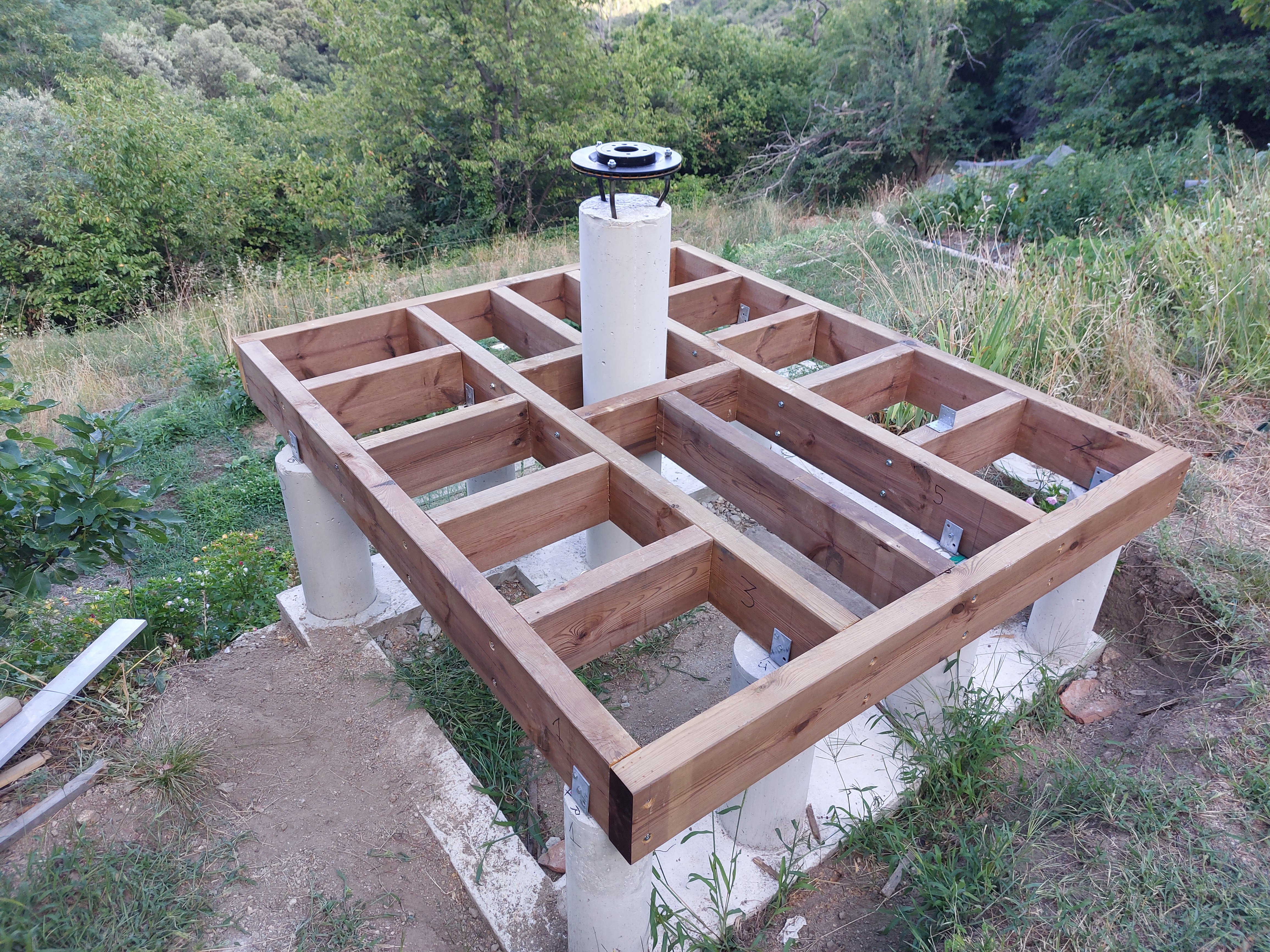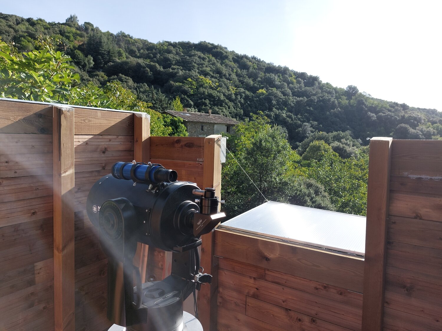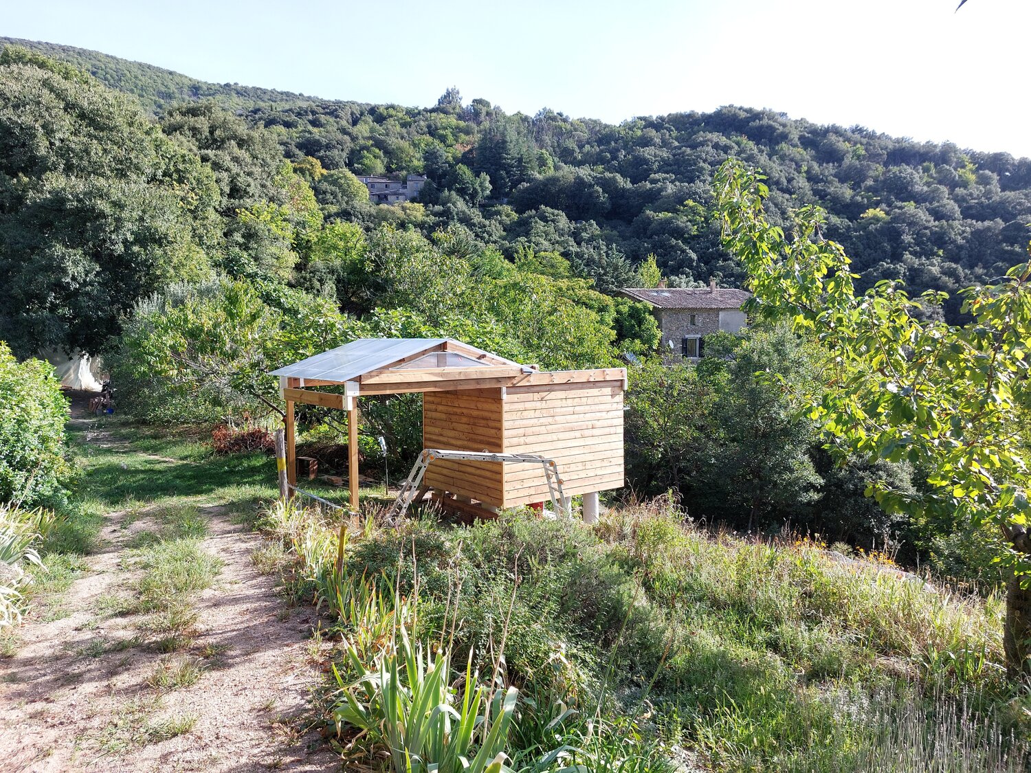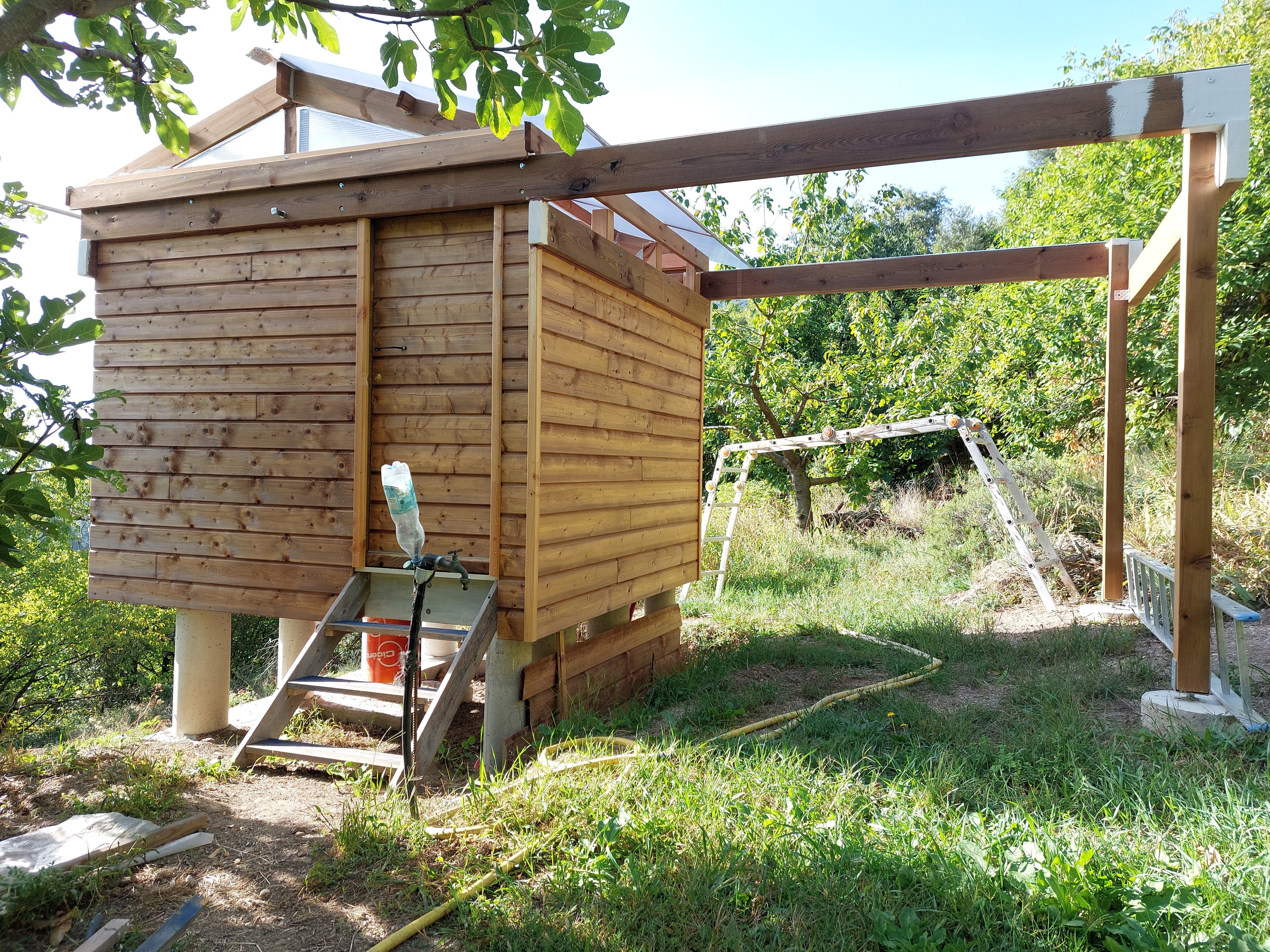Ton idée au départ m'a séduit, mais j'ai un autre impératif don je n'ai point parlé : les deux traverses qui supportent le poids du toit ouvert passe au dessus d'un chemin d’accès (sur dernière photo là ou il y a l’échelle) à une partie importante de mon terrain, je dois pouvoir passer dessous! Minimum 2m10 même avec des parois de 1,75m je vais devoir excavé le passage de plus de 40cm, terrain en pente... C'est pourquoi j'avais envisagé le dôme... Et qu'une partie de l'abri sera au -dessus du vide (On voit aussi sur les photos les plots ne sont pas symétrique à la colonne) pour laisser le passage.... C'est bien d'être dans une zone de réserve de ciel étoilée : Parc national des Cévennes, mais le terrain en bancels (terrasses) plus ou moins étroites, vallée profondent rendent l’implantation d'un abri difficile. -