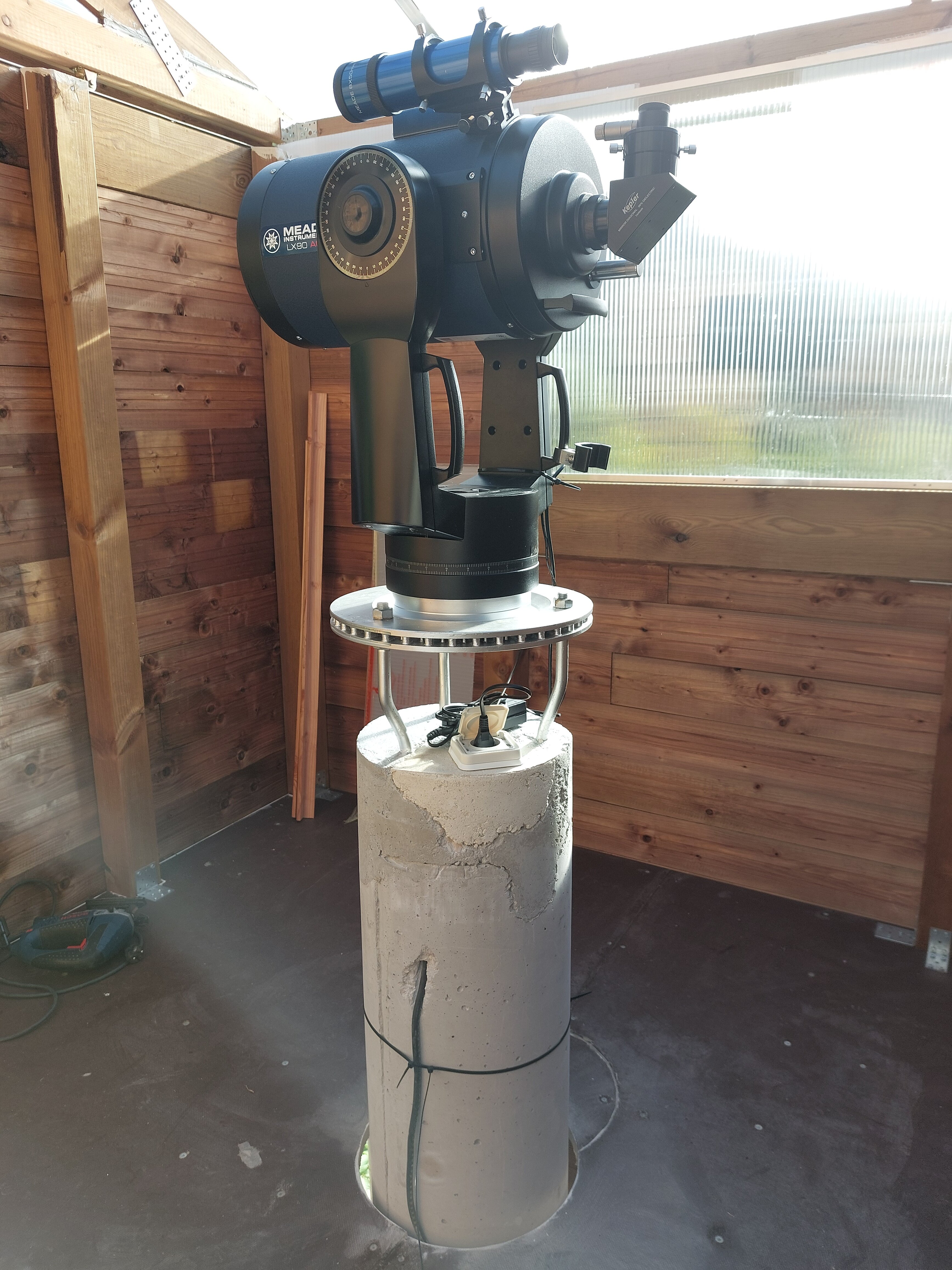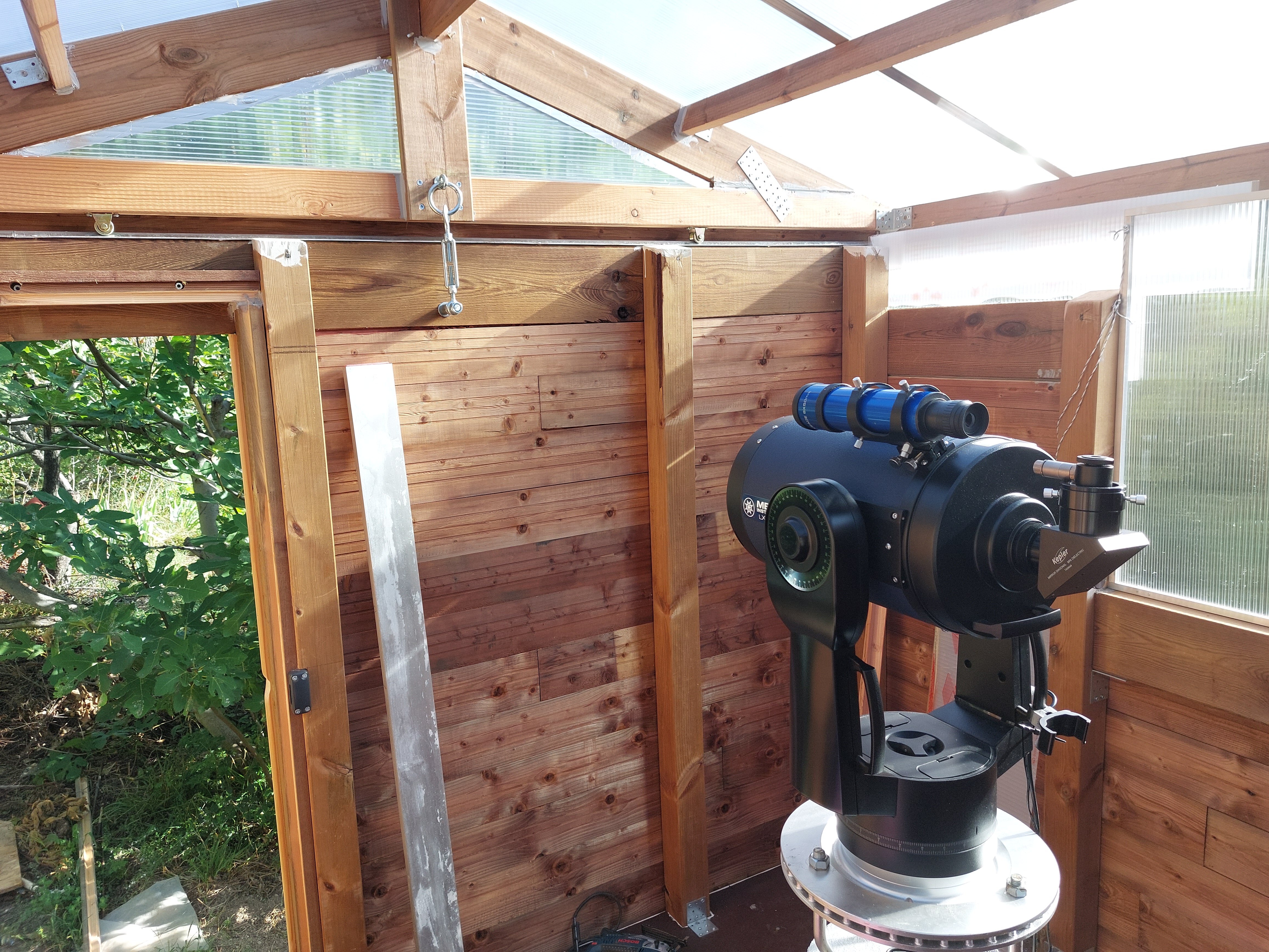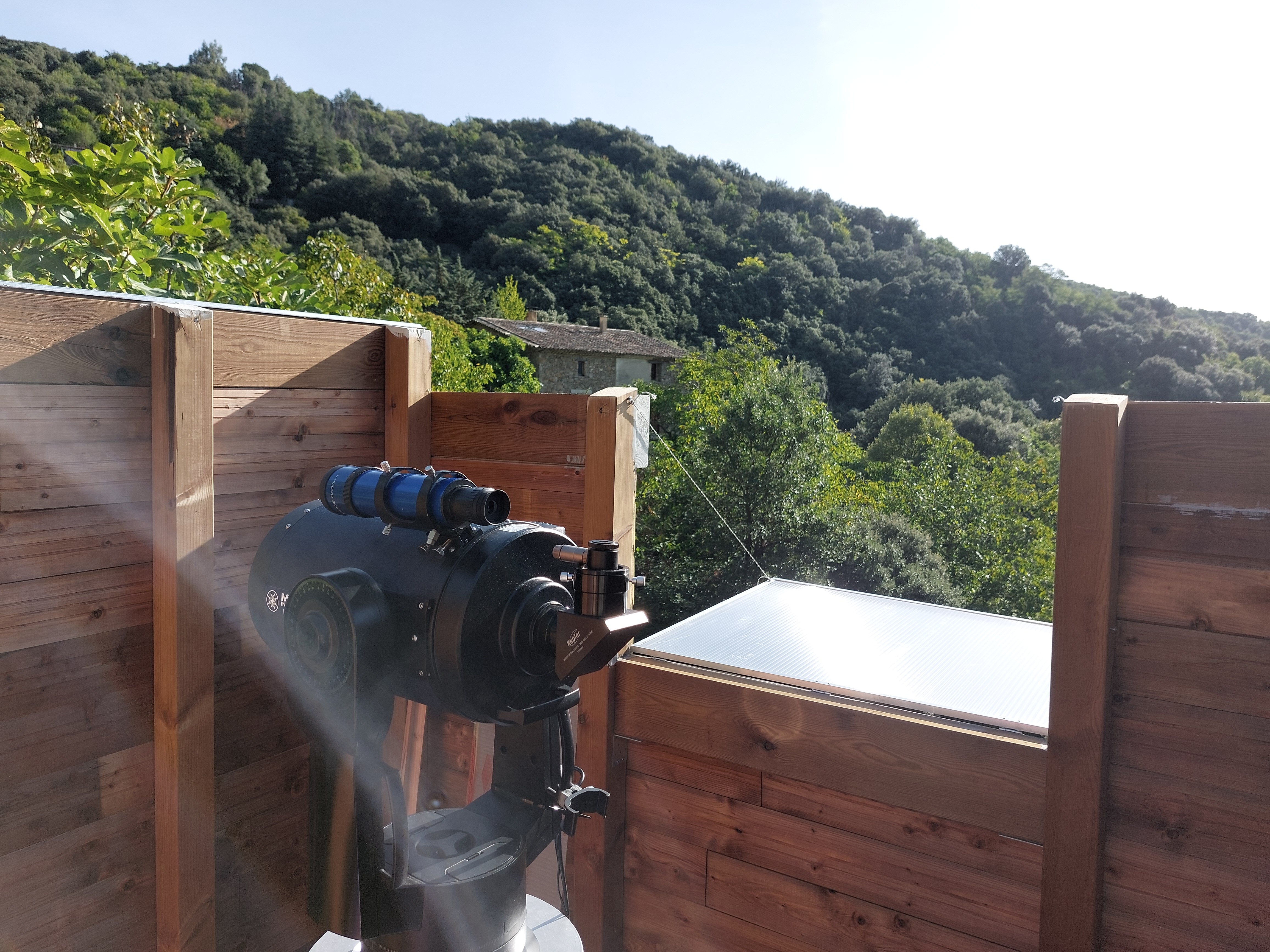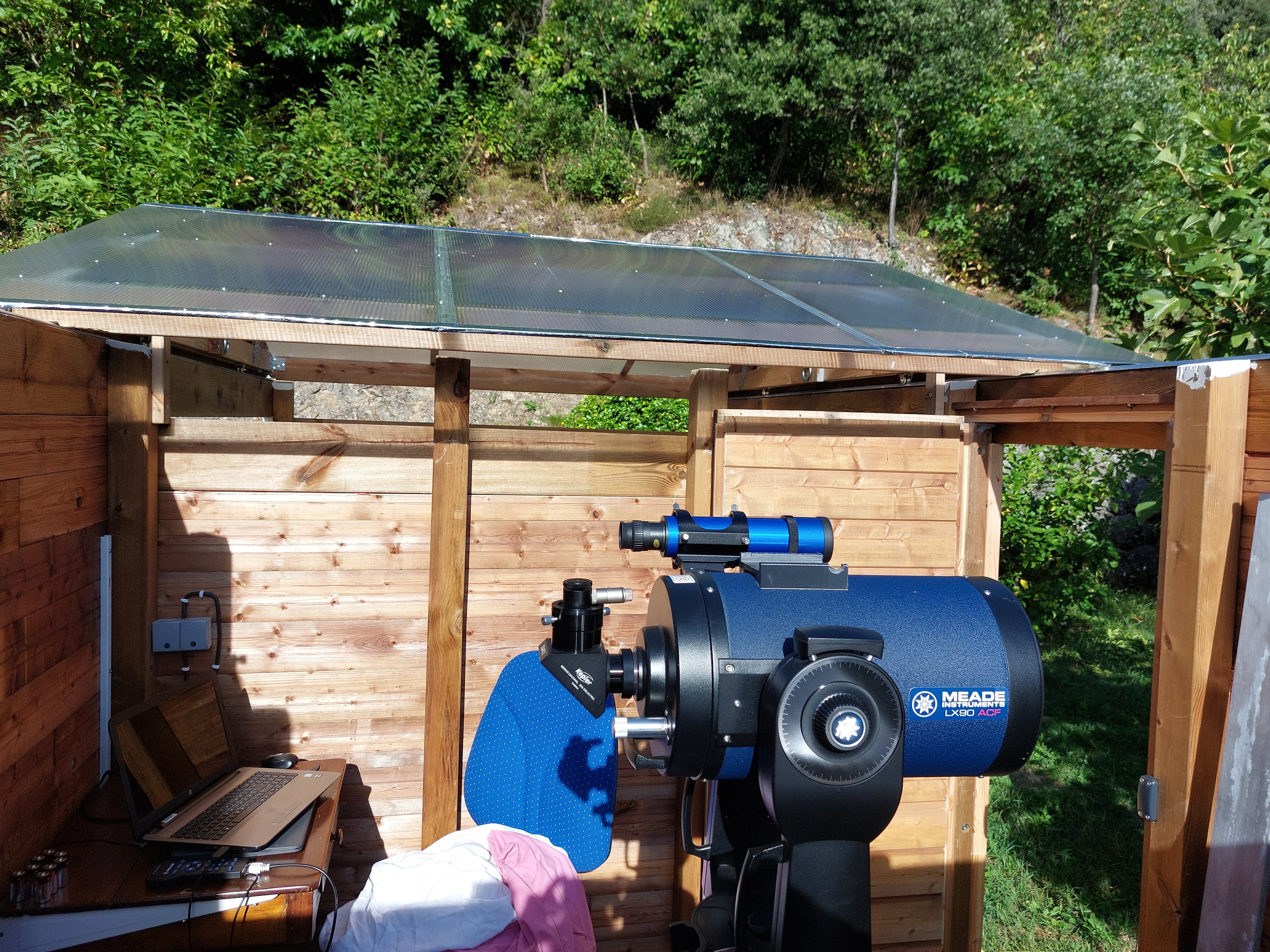 Bonjour à tous! Je réalise un abri pour mon télescope la colonne et les plots sont réalisés. A l'origine du projet je devait réaliser une coupole de 2m20, ce qui m'aurait permis un champ d'orientation du télescope de 360° horizontalement et de 180° verticalement. C'était sans compter que je suis dans un vallon et que je suis entouré d’arbre sauf en direction du sud_est sur 90°. De plus la réalisation de la coupole ma rebuté coté prix, j'ai dons basculer vers une cabane à toit coulissant. Ma question est la suivante avec la taille de la cabane 2,5m de long sur 2,29 de large et une hauteur maxi des cloison de 1m 75 le champ de vision est rétréci à 114° : est-ce suffisant pour observer suffisamment d'objet céleste ? Je pourrais baisser la hauteur mais mesurant 1m82 et souhaitant installer un coin PC dans la cabane je ne voudrais pas trop baisser la hauteur. merci d'avance pour vos conseils! pat