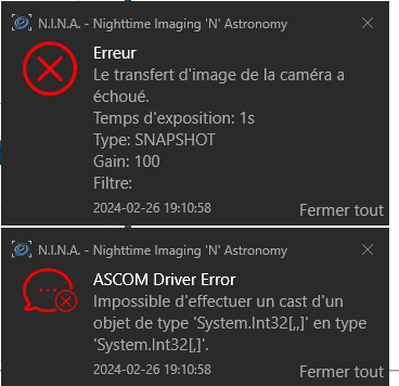 Bonsoir, Je commence également avec NINA et tente d'acquérir une image avec ma caméra 533 MC. Je pense avoir bien configuré mais j'obtiens un message d'erreur comme suit : Une idée de la cause de ce message ? J'ai mis à jour les drivers ASCOM. Merci de votre aide Michel