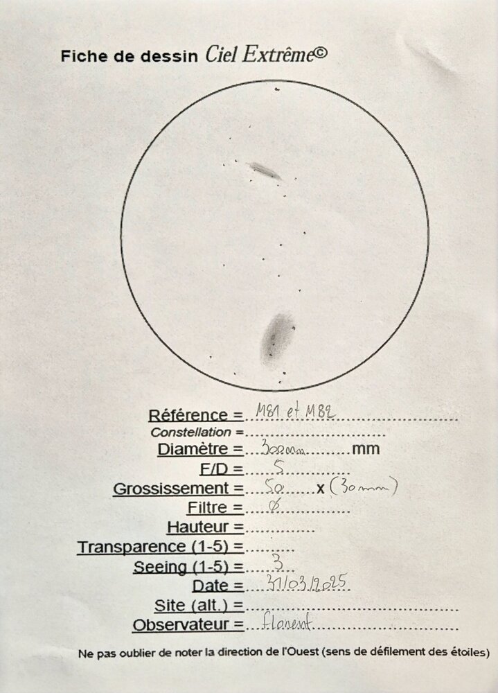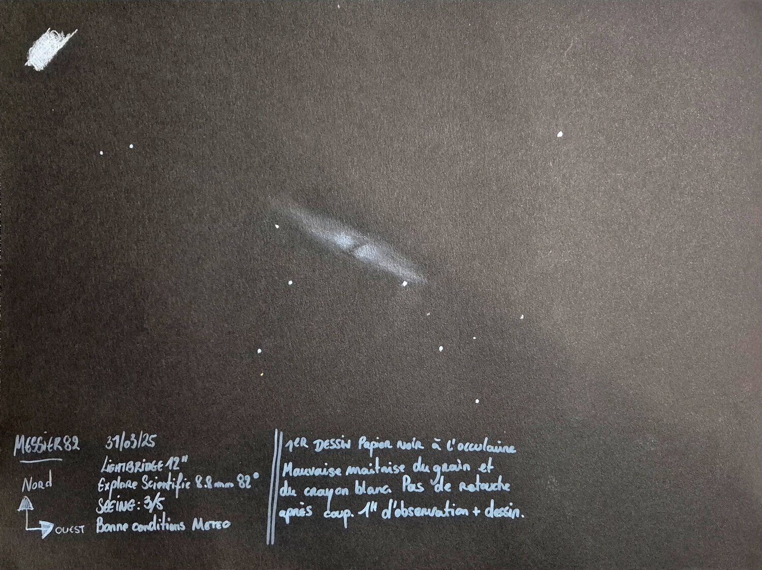 Une fois n'est pas coutume, mais demain, c'est le retour de la grisaille alors comme les conditions s'y prêtent, j'y retourne. J'ai 30 min de plus qu'hier pour me faire plaisir alors j'ai sorti les crayons cette fois-ci. J'ai desserré les fixations du miroir et c'est déjà beaucoup mieux (plus de comète) mais les conditions ne m'ont pas permis d'avoir de belles têtes d'épingles. Ou bien, c'est vraiment la qualité native du miroir qui pêche, je ne sais pas. En-tout-cas, mise en température au top, collimation aux petits oignons, pas de vent : que du bonheur. Seule l'humidité ambiante tourne autour de 50% et le seeing à 3/5. Ma cible ce soir, après un petit échauffement au hasard des astres qui me passent sous le nez, fut Messier 82. Depuis hier, j'ai eu envie de lui tirer le portrait, alors je ressorts le lightbridge 12'' et je lance la même cuisine: 30mm, 16mm et 8.8mm. 30mm: cela devient facile de trouver le couple avec le point rouge et l'oculaire grand champs. Le couple est là, baignant dans un petit champ d'étoiles peu fourni de faible éclat. Comme hier, le fond de ciel est clair et les détails absents. Seul la magnitude apparente des deux galaxies se différencie, m 81 de forme ovale, subtile et étendue et m 82 contrastée, fine et au contours presque saillant. Le premier croquis s'impose, car le champ est large, c'est beau et j'en veux un souvenir. Et bien, ce fut laborieux ! D'abord ébloui à la lumière rouge, je ne voyais pas mieux que ça et le rendu final n’est pas aussi fidèle à la réalité qu'escompté. À l'oculaire, le croquis c'est une autre affaire ! 16 mm ou 8.8 mm : j'ai longuement hésité à choisir la focale suivante pour le deuxième dessin. Le 16 mm offre plus de champs, mais moins de détails dans la galaxie. Plus subtile à l'œil, ce sera d'autant plus compliqué à reproduire avec la mine blanche. Le 8.8 mm donne une belle galaxie qui prend la moitié du champ, nuancée en vision décalée, mais qui file tel Lewis Hamilton hors de l'oculaire. Au final, je rangerais le 16 mm. J'aurais passé, sur cette session, plus de temps à me flinguer la vision nocturne avec ma loupiote rouge qui n'éclaire pas assez qu'à observer/dessiner. Toutefois, en dansant autour de cette tranche, j'aurais pu imaginer un bulbe central barré par une bande obscure et prolongé par des bras spiraux de plus en plus diffus à mesure qu'on s'en éloigne. Elle est belle cette galaxie. Au crayon, même déception. Je n’ai pas la fidélité de ma rétine au bout des doigts. Il n’est pas aisé de maîtriser le pigment et je tire mon chapeau bien bas à ceux qui le font avec brio. Beau ciel à vous, Florent -