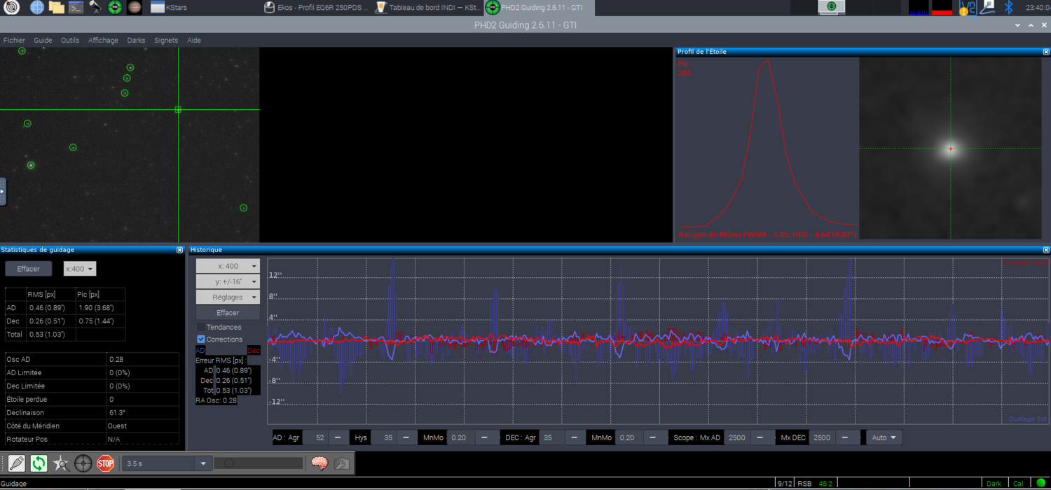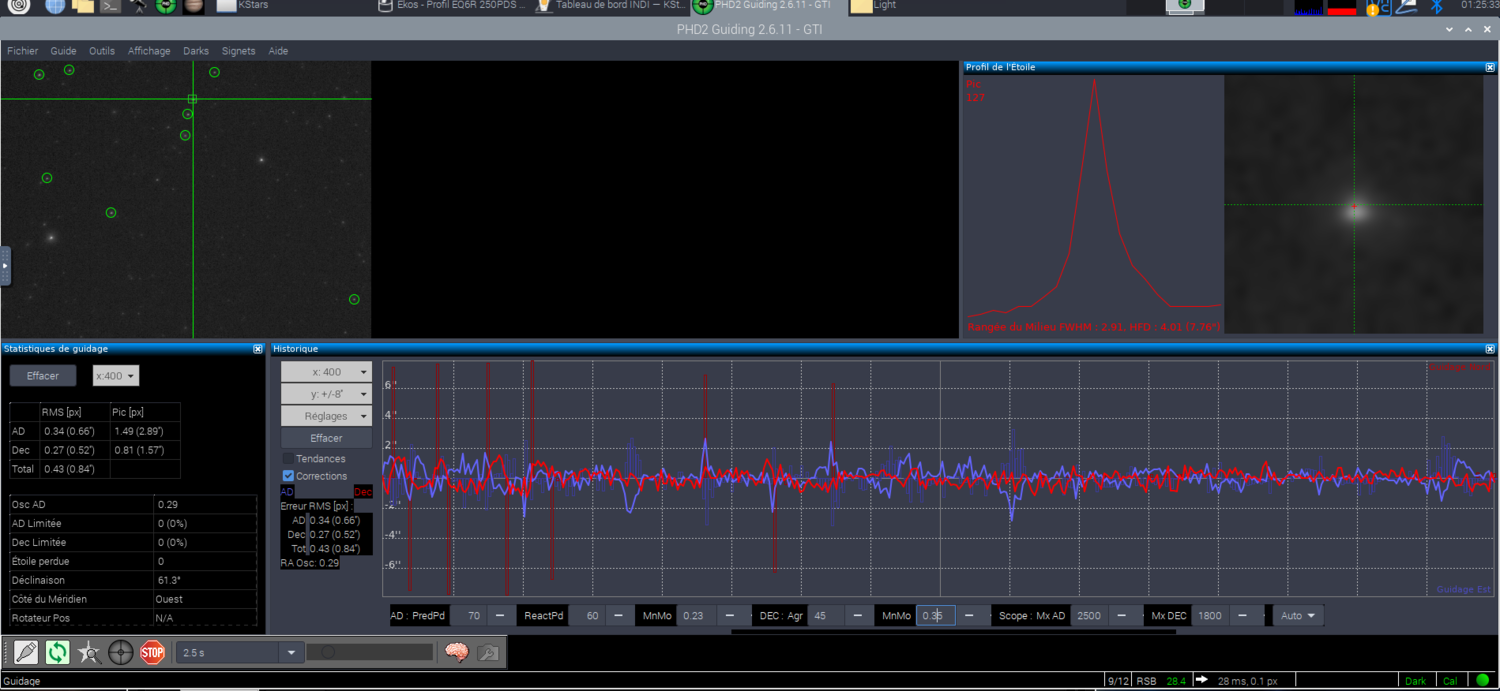 Salut à tous, Après deux nuit j'ai réussis à récupérer 200 poses de 120 secondes sur la nébuleuse de la bulle. C'est clairement trop tôt pour la shooter mais j'attendais depuis tellement de temps 🤣 Ce matin au réveil je me suis demandé pourquoi une partie des images étaient violettes, j'ai vite compris que l'aurore boréale était passée par la Je vais passer par la case démontage de la monture car j'ai des soucis d'autoguidage : En hystérésis sur l'AD cela fait des dents de scies. En PPEC : un peu mieux mais toujours des dents de scie, pas glop ... Enfin la mise en station avec astroberry est super simple : Le Matériel : EQ6R Pro Canon eos 6d réglé à 800 Isos, Filtre Optolong clip filter UHC, Astroberry : 200 light de 120 sec, dithering aléatoire PHDD2, 250/1200 + Baader 2" Correcteur de coma MPCC Mark III + masque de chanfrein Zwo focuser Bortle 5 Résistance chauffante usb pour chaque lulu Guidage Zwo asi mini + lunette guide 80/400 Guidage entre 0.4 et 0.6 de RMS mais des pics de fou... Place à l'image avec une reduction script Bill : Sans réduction : Traitement de 144 images sur la première nuit : Toujours friand de vos retour, Bon ciel à tous A+ Nico.