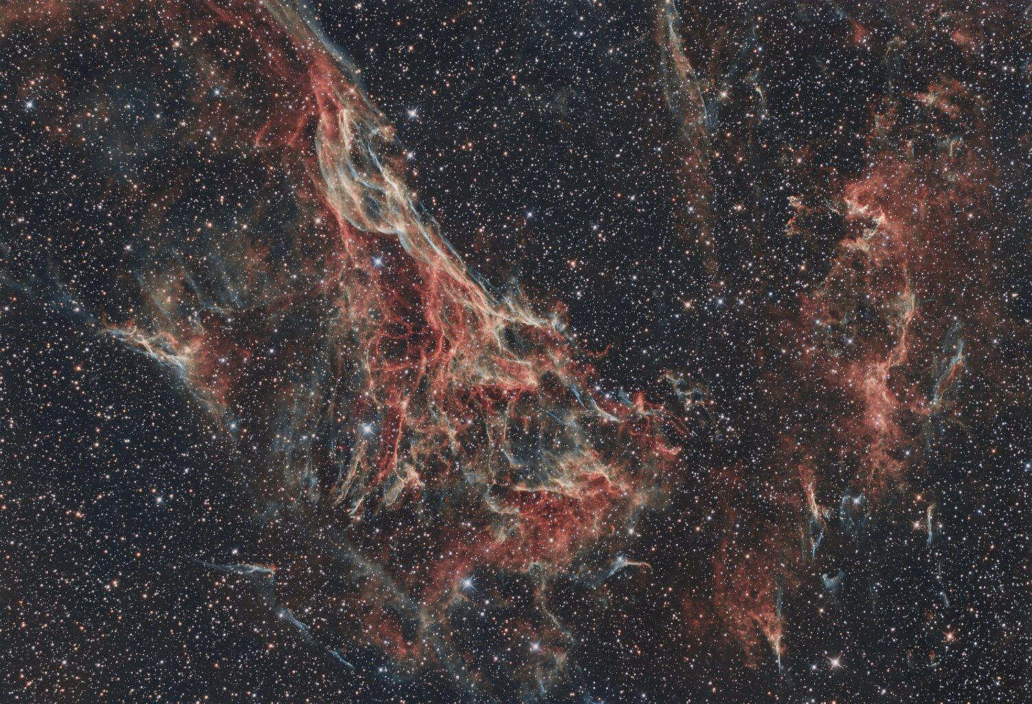 Salut à tous, Toujours en pleine phase de découverte avec mon TS Mirro-sphère — flambant neuf pour moi, même s’il a déjà une petite décennie au compteur 😍 J’ai profité de deux nuits claires pour shooter la partie Est des Dentelles du Cygne. Un vrai bonheur de pouvoir composer mon cadrage avec N.I.N.A, c’est un outil vraiment top ! D'autres zones des Dentelles sont déjà dans mes cibles à venir… Peut-être qu’un jour, je me lancerai dans une vraie mosaïque 😉. Un peu de wikipédia: NGC 6992 (Caldwell 33) est une région des Dentelles du Cygne situées dans la constellation du même nom. NGC 6992 se situe dans la partie nord-est de ce rémanent de supernova[1]. NGC 6992 a été découverte par l'astronome germano-britannique William Herschel en 1784. 🔧 Setup : 🔭 Télescope : ONTC 200/800 (Miroirs Mirrospheres) 🔧 Correcteur : Baader MPCC Mark III 📷 Caméra : ASI 294 MC (–10°C, Gain 120, offset 30) + Focusser Génimi 🗺️ Monture : EQ6-R Pro 🎯 Autoguidage : lunette guide 50/180 + ASI 120MM mini sous PHD2 🌈 Filtre : Antlia triband rgb ultra ii 2" 💻 Capture : N.I.N.A : 85% de 137 poses de 180 secondes conservées (presque 7 heures sur deux nuits) Ratio sigma entre 4.55 et 4.68 sur les 2 nuits Echantillonnage : 1.192 Illumination Lune : 45.2% et 33.6% (ca devient intéressant ) Angle de rotation 240 ° FWHM médiane : 3.22 sur le stack final 🔧 Traitement : Siril : Astrométrie + rotation 180 ° (je la préfère dans ce sens la :p) Graxpert background extraction : smoothing = 0.20 Cosmic clarity sharpening Sharpening mode : boyh Stellar amount 0.5 Non stellar strength :2 Cosmic clarity denoise Denoise mode : full Denoise strength :0.15 Pix : Vertical mirror (Pourquoi le vertical miror après le passage de Siril à Pix) Ez soft stretch réglages de base SCNR : 0.80 Starnet HDMRT avec mask sur le layer 7 Un poil de color sat Une toute petite courbe en S SCNR à 0.69 sur starless et masque d'étoiles, il me restait du vert ... NoiseXterminator Denoise 70% Detail 30 % Recombinaison starless et starmask avec pixel math et la formule trouvée sur photonmillenium : ( ~((~Starless)*(~star_mask)) ) Une deuxième version pour la réduction d'étoiles à 0.30 en pixel math avec le script de Bills star réduction ( S= 0.30; Img1= Starless; ~((~mtf(~S,$T)/~mtf(~S,Img1))*~Img1) ) Place aux photos V1 la starless : V2 sans réduction d'étoiles : V3 avec réduction d'étoiles : Avec un peu plus de contraste la V4 V5 et V6 dans le meme ordre , Starless , sans réduc et avec réduc : A+ Bon ciel à tous Nico
