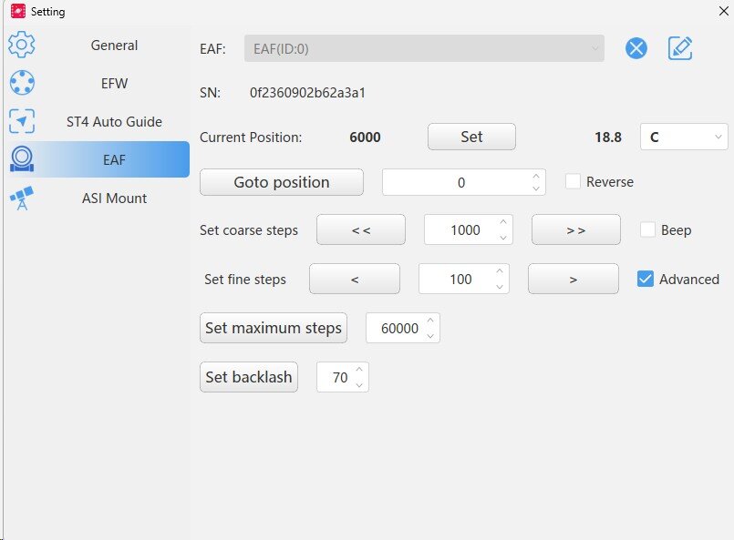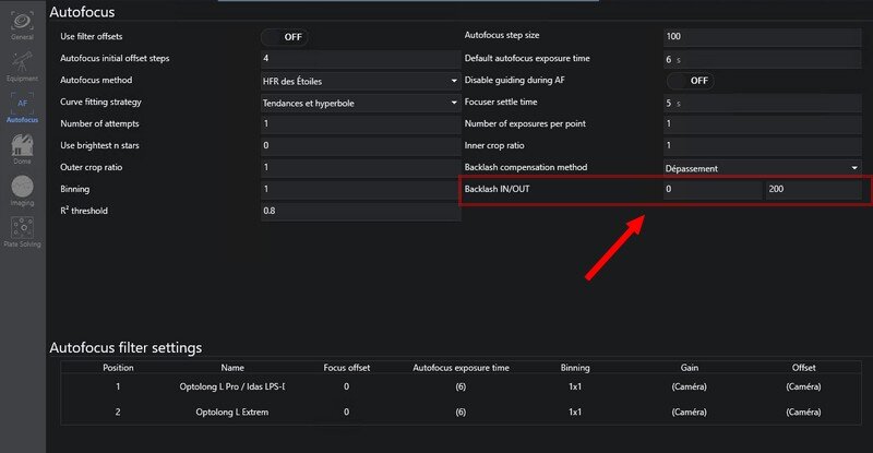 Bonjour à tous, Questions que je me pose : lorsque l'on paramètre un EAF via ASI Studio par exemple pour positionner le point 0, tester, il y a le backlash qui peut être déclaré. Dans NINA on a la section dédié à l'Autofocus : Les deux se cumulent-ils si on déclare la valeur des deux côtés, ou non, il le gère de son côté et ne prend pas en compte la valeur déclarée via ASI Studio, un peu comme l'ASIair mais lui c'est parce que son algo permet de ne pas en tenir compte ? Je pose la question, car j'ai une courbe un peu curieuse en ce moment pour paramétrer la MAP de mon nouveau Mak 180 et son EAF dédié ! 🤔 Question du même ordre : je n'arrive pas vraiment à comprendre quand on doit cocher "Reverse" dans ASI Studio... Peut-être que la courbe curieuse et inversée (habituellement, l'hyperbole ou la parabole sont dans l'autre sens dans NINA) découle un peu de ces choix... Merci pour votre aide, Philippe -