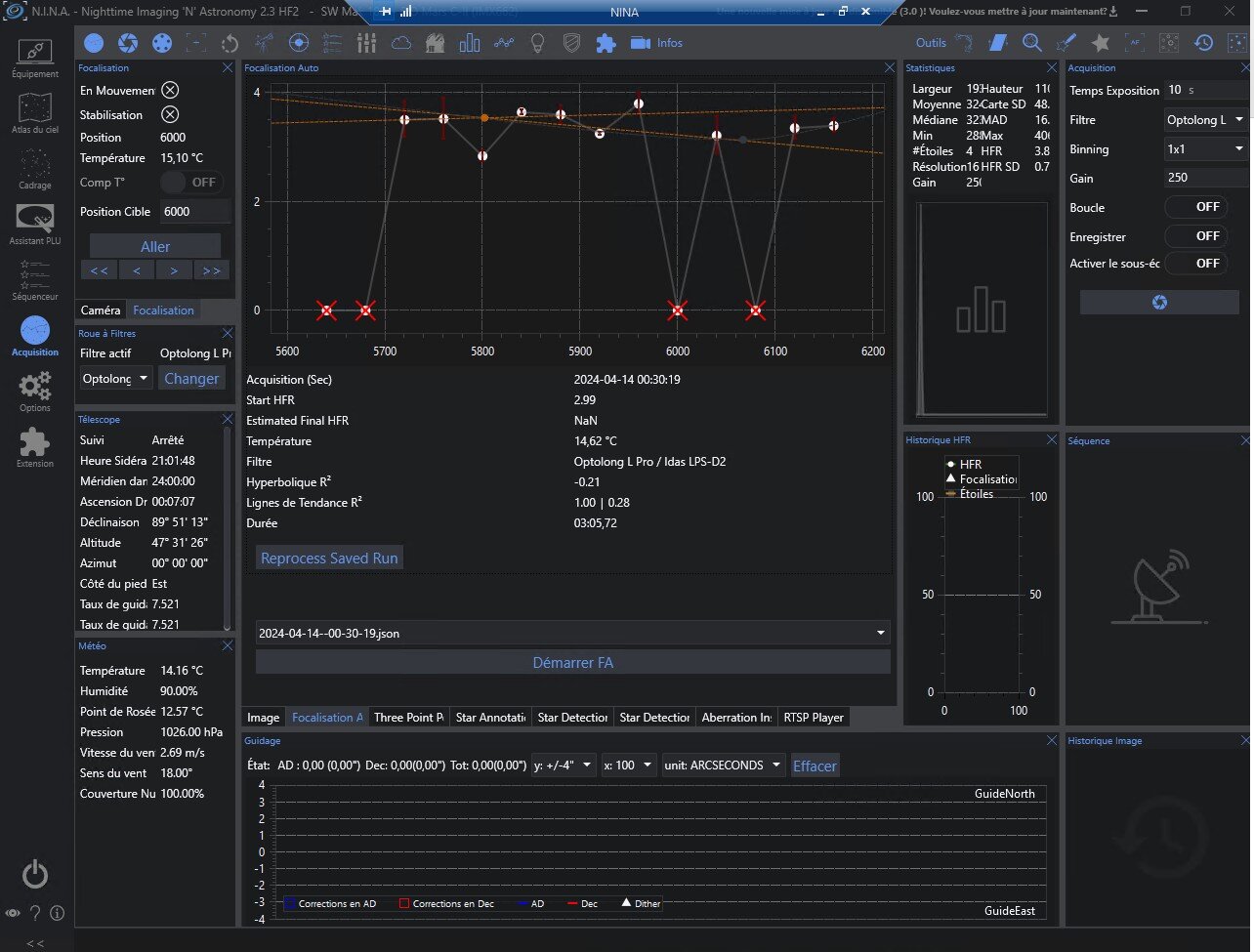 Bonjour, Merci pour ta réponse ! 🙂 Bon, cela rassure un peu, ceci dit, j'ai lancé pas mal de MAP avec des valeurs différentes en step size et backlash, car au départ j'avais une courbe plate, mais il s'est avéré qu'un mauvais serrage au niveau du coupleur de l'EAF avait laissé du mou et des fois ça accrochait d'autres fois non, je me suis arraché les cheveux sur al tête avant de regarder le mouvement de la molette micro de mon focuser et là j'ai compris ! Je suis parti d'un step size de 200, puis 100 et 50 et j'ai fait varier le backlash de 400 à 300, 200 et 100, mais a priori quelle que soit la valeur, je n'avais pas le sentiment que cela changeait grand chose, d'où mon interrogation sur la gestion du backlash ! La course n'est pas très longue de toute façon. Pour en revenir à l'image, vu qu'à 2 700 mm de focale on n'a pas beaucoup d'étoiles dans le champ, j'en ai choppée deux ou trois après avoir poussé le gain et le temps de pose et cela me semblait correct (voir capture écran ci-dessous). J'étais arrivé en bout de nuit, j'ai pas pensé à sortir le Bahtinov pour contrôler, je le ferai la prochaine nuit claire en espérant que cela ne soit pas dans 5 mois, LOL ! Pour NINA, je suis toujours en version stable, j'ai déjà eu mon lot de galères avec des trucs "standards", alors ce n'est pas la peine d'en rajouter ! 😉 Je suis sur la dernière stable 2.3. 9001. J'ai vu que la v3.0 s'est présentée en stable dans la barre supérieure de NINA, je vais attendre un peu... Je ne vois pas où tu peux vérifier cela, car j'ai effectivement installé l'add-on Hocus-Focus au départ quand j'avais mes soucis d'étoiles allongées dans les angles et que je ne savais pas trop à quoi c'était dû entre le backfocus, le guidage, le tilt, etc., mais je ne l'utilise plus car il me donnait des résultats assez surprenants parfois !! Mes lulus ne sont pas des Petzval hélas, donc à chaque fois faut gérer le BF... hormis mon RC et mon Mak... Par contre, sais tu comme je le demandais si le BF se cumule si on le déclare dans la zone de gestion de l'EAF sous ASI Cap avec celui de NINA ou non, c'est géré indépendamment ? Je n'ai pas retrouvé de trace de cela dans le manuel en ligne de NINA ! Je voudrais surtout écarté des trucs de ce genre pour savoir si la MAP que j'ai obtenue est ce que je dois obtenir dans le meilleur des cas ! Le bahtinov sera en partie le juge de paix, mais en photo lunaire, ce sera plus rock'n'roll de savoir quand la MAP sera optimale avec la turbu de ce que j'ai vu ! Philippe -