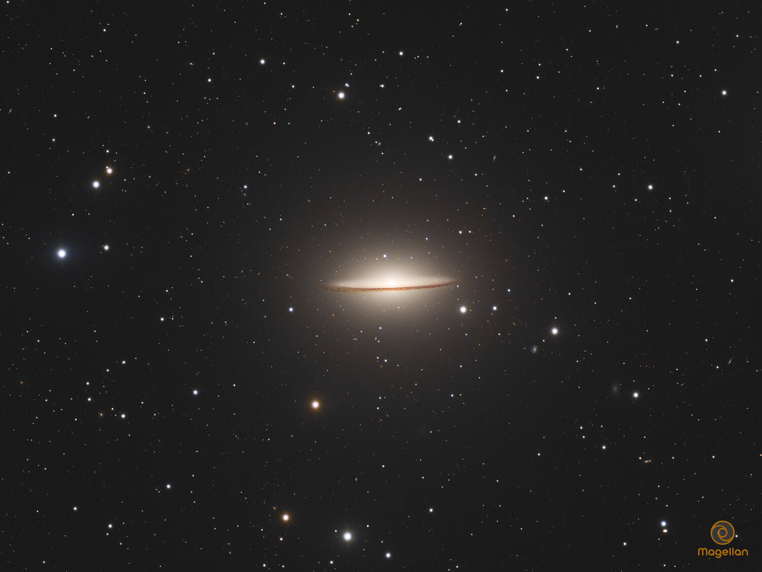 Salut les astrams 😀, Nous vous présentons cette jolie galaxie, M104, shootée depuis Deep Sky Chile. L’excellent ciel du Chili nous a permis d’obtenir ce résultat « honorable » compte tenu de la dimension apparente de l’objet qui nécessiterait un tube de gros diamètre pour obtenir plus de détails. Comme d’habitude nous vous recommandons d’aller jeter un œil à la full ici : https://app.astrobin.com/u/Magellan_Team?i=k4xr3b#fullscreen Les caractéristiques d’acquisition sont dans le tableau ci-dessous. En espérant qu’elle vous plaise, bon ciel à tous ! 😀 Marian, Jean-Mi, Lolo, Gégé, Dave et Jean Messier 104 : Le Sombrero Découverte en 1781 par Pierre Méchain et ajoutée plus tard au catalogue de Charles Messier et nichée à environ 30 millions d'années-lumière de notre propre galaxie dans la constellation de la Vierge, se trouve un véritable joyau du ciel profond : Messier 104, plus communément appelée la galaxie du Sombrero. Son surnom évocateur lui vient de son apparence frappante, qui rappelle étrangement le couvre-chef mexicain, avec son large disque et sa bande sombre distincte. M104 est une galaxie spirale non barrée singulière par la bande de poussière sombre et épaisse qui traverse son bulbe central lumineux. Cette bande est en réalité un vaste anneau de poussière cosmique et de gaz froids, où se forment de nouvelles étoiles, masquant une partie de la lumière des étoiles situées derrière elle. Le bulbe central de M104 est extraordinairement brillant et dense, abritant une population très importante d'étoiles plus anciennes et, comme c'est souvent le cas au cœur des grandes galaxies, un trou noir supermassif. Les observations ont révélé que ce trou noir est particulièrement massif, avec une masse estimée à environ un milliard de fois celle de notre Soleil. Autour de ce bulbe, on observe de nombreux amas globulaires, des grappes denses de milliers à des millions d'étoiles, qui orbitent autour du centre galactique.