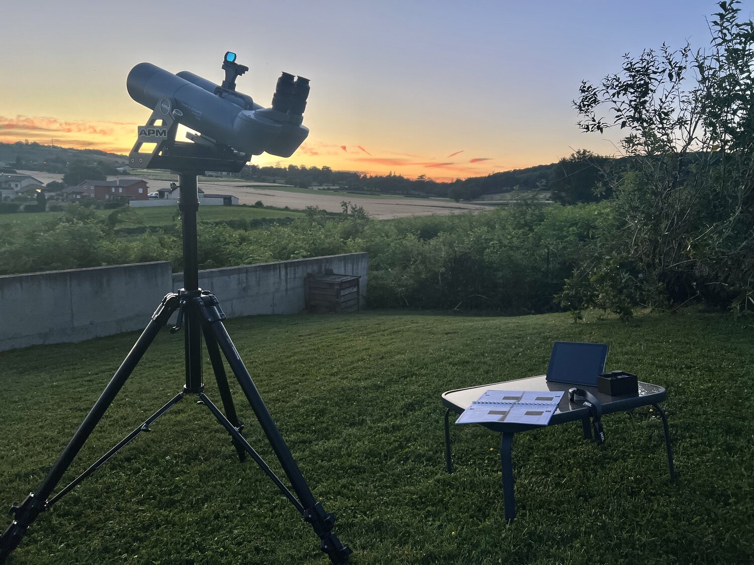 Bonjour à tous, Voici un petit topo tant que c'est frais dans ma tête et que je comprends encore mes notes : Lieu : sur ma terrasse en périphérie de mâcon (71) Conditions : ciel plutôt bon (Voie lactée bien visible), éclairage public éteint même si quelques lampadaires au loin et des "veilleuses" de voisin gênent une vision nocturne optimale Matériel : jumelles APM 100ed APO + oculaires 20mm 62° Explore Scientific Chercheur point rouge APM Observations de 23h30 à 2h30 Plan directeur des observations : le chapitre 4 du bouquin de Jean Raphael Gilis, "j'observe le ciel profond avec une lunette de 60 mm", avec quelques écarts pour varier les plaisirs. En attendant 23h pour l'extinction de l'éclairage public, observation du croissant lunaire en compagnie de mes filles. Très joli piqué et détail malgré le faible grossissement. Un peu de chromatisme sur l'extérieur du disque quand elle se rapproche du bord du champ mais sinon au centre, parfait. J'en profite pour tester les oculaires 14mm 82° toujours de chez Explore Scientific. Le Gain en grossissement est notable mais je trouve l'observation moins piqué et surtout moins confortable avec ces oculaires, dommage. Je repasse sur les 20mm. La nuit étant assez noire à 23h30, c'est parti pour le ciel profond : Amas Globulaire M5 - Serpent : malgré sa facilité réputée (décrit comme visible à l'oeil nu dans le bouquin...), j'avais galéré à le trouver lors de ma dernière observation. J'ai tenté un autre cheminement au départ de l'étoile 109 de la vierge puis 110. Et là çà va tout seul. Au passage, l'étoile 109 vierge est une double que j'ai cru pouvoir résoudre au 1er pointage, mais en y revenant ensuite, je n'en voyais plus qu'une donc le doute persiste Amas globulaire NGC 5897 - Balance : Pointage au départ de l'étoile "sigma Balance" : impossible de le discerner. Je suis certain qu'il est dans le champ, car j'ai bien toutes les étoiles du champ simulé visibles mais même en vision décalée ou en balayant la zone, Nada. Cela confirme la classification difficile du bouquin. A retenter lors d'une sortie nomade sous de meilleurs cieux Amas Globulaire M80 - Scorpion : Au départ d'Antares, puis Alniyat, on le trouve facilement à l'aide d'un chemin d'étoiles brillantes. Assez petit mais parfaitement visible en vision directe Amas Globulaire M4 - Scorpion : très simple à pointer au départ d'Antares. Plus discret que lors de ma dernière observation en nomade, au cours de laquelle j'avais réussi à observer son compagnon NGC 6144. Pour ce soir, échec sur ce second amas du champ, la pollution lumineuse de Mâcon lui est fatale Amas Globulaire M62 - Ophiuchus : Malgré sa faible hauteur, pointage assez simple et rapide au départ de epsilon Scorpion Amas Globulaire M19 - Ophiuchus : cheminement facile en remontant depuis M62. L'amas semble beaucoup moins diffus que ses congénères en sa périphérie. Amas globulaire NGC 6284 - Ophiuchus : premier des 2 globulaires dans le voisinage de M19. Trouvé relativement facilement malgré sa faible brillance. Il est bien visible en vision décalée mais très faible en directe. Amas globulaire NGC 6293 - Ophiuchus : toujours au départ de M19, pointage relativement simple également. Il est un peu plus évident que 6284 mais reste très faible malgré tout. Amas Globulaire M9 - Ophiuchus : Au départ de l'étoile Sabik (Ophiuchus), pointage assez simple. Amas globulaire NGC 6356 - Ophiuchus : pointage facile au départ de M9. Les 2 amas rentrent d'ailleurs dans le même champ, et c'est très sympa de comparer les différences de brillance entre les 2 Amas globulaire M107 - Ophiuchus : Au départ de Zeta Ophiuchus, il se trouve relativement facilement mais en étant attentif car il est vraiment pâle, on aurait vite fait de passer dessus sans le voir. Mais aucun doute en vision décalée, il est bien là, confirmée par la position des quelques autres étoiles du champ. Amas Globulaire M14 - Ophiuchus : le pointage conseillé par mon bouquin partait de Beta Ophiuchus, mais j'ai galéré à me repérer en partant de là, trop peu d'étoiles. Au final, je suis revenu sur l'étoile Sabik, pour aller sur Nehushtan, et là on a un chemin d'étoiles brillantes facile à suivre. Amas Globulaire M10 - Ophiuchus : Retour sur zeta ophiuchus comme base de départ. Avec Skysafari, On chemine assez facilement parmi les étoiles brillantes pour arriver à la cible. Amas Globulaire M12 - Ophiuchus : Au départ de M10, on le trouve facilement. Petite boule compacte avec peut être quelques étoiles qui se détachent. Amas ouvert IC 4665 - Ophiuchus : Au départ de Beta Ophiuchus, l'amas est juste à côté en remontant un peu. Il tient quasiment tout le champ de 2°, et çà change de la tripotée de globulaires observée jusqu'ici 😄 Amas ouvert NGC 6633 - Ophichus : en se basant sur les 2 étoiles 71 et 72 de la constellation, on chemine assez facilement jusqu'à la cible. La vision de l'amas rempli une bonne partie du champ et est vraiment sympa car il ya beaucoup d'étoiles plus ou moins lumineuses. Amas ouvert IC4756 - Ophichus : pas dans le bouquin, mais je vois sur Skysafari qu'il est tout proche de NGC6633 donc go pour le tenter. Il est encore plus étendu que ce dernier, mais avec moins de différence de brillance dans ses étoiles membres. En attendant que le sagittaire sorte un peu du halo de pollutiion lumineuse ( et aussi pour changer un peu des globulaires qui se ressemblent un peu tous), je pars sur la grande ourse qui est assez haute pour tenter des galaxies que je n'ai jamais trouvé avec mes rares sorties Dobson. Direction Mizar pour commencer pour observer cette superbe double facile à dissocier. Galaxie M101 : sans trop y croire, depuis Mizar, je chemine par les étoiles 81, 83, 84 et 86 de la grande ourse, et là bingo, une grande étendue diffuse me saute aux yeux, la voilà enfin dans la musette. Je m'attarde un peu en alternant vision décalée et direc
