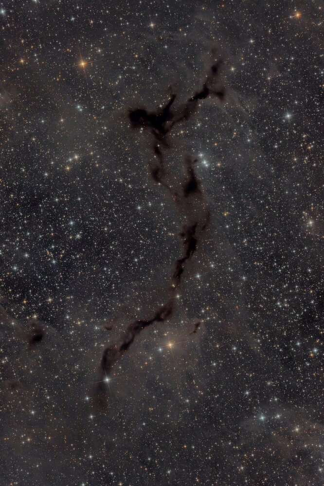 Bonjour à tous, Je vous présente ma version de la nébuleuse sombre Barnard 150, alias la nébuleuse de l’hippocampe dans la constellation de Céphée. Imagée sur 3 nuits sans lune en début de semaine. Acquisition avec un Newton ONTC 200 F5, et le correcteur Starizona Nexus 0,75, soit une focale de 750mm, équipée de la 2600 mono et de filtres Antlia Pro. Le tout sur monture AZEQ6 Concernant les exifs, 15h40 de poses réparties ainsi : RGB : 24x300s pour chacun des filtres Luminance : 116x300s Traitement avec pixinsight et finitions sous Lightroom. J’espère qu’elle vous plaira. Le lien vers la full : https://astrob.in/p036g2/0/