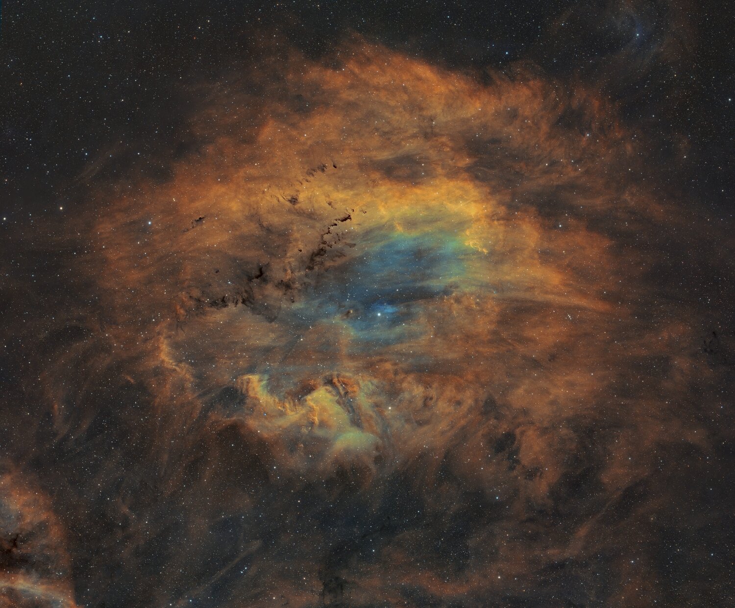merci à tous ☺️ non pas de luminance combinée ici, je n’arrive jamais à de bons résultats sur ce type de nébuleuses avec signal très différents entre les filtres. j’ai travaillé mes couches séparément en détails et montée d’histo, et j’ai booste la O a coup de GHS et de transfo exponentielle après avoir créé un masque des zones qui m’intéressaient pour ne pas trop dégrader le ciel qui devenait vite vilain entre le bruit et les halos. j’ai ensuite mixé le tout de manière classique avant de retoucher avec quelques courbes