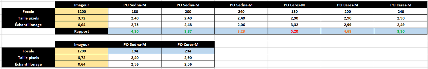 Bon, ça confirme que je n'avais pas compris.. xd J'ai fait pas mal de recherche donc je me suis fait un petit tableau, je pense que c'est bon cette fois.. j'espère. Donc si on part du principe que je prend la Sedna, la focale optimal du viseur serait 194, mais bon, pas possible, donc soit 180 ou 200. Une question par contre, est-il mieux d'être légèrement supérieur ou légèrement inférieur au rapport de 4 ? Si j'ai bien compris, en dessous on tend vers le sur-échantillonage et au dessus vers le sous-échantillonage, du moins, d'après ce que j'ai vu. -