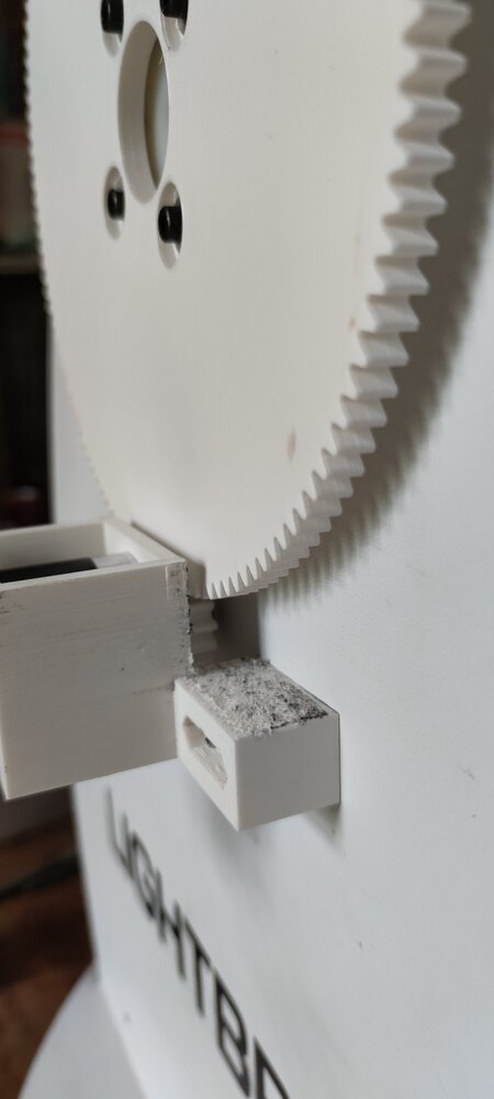 1. bonjour, top le teenastro, j'en ai un aussi sur un lightbridge 300/1500. le système fonctionne super bien mais en pointage je suis très souvent dans les choux! je pense malgrès tout que cela vient de la partie mécanique, j'ai sur L'axe ALT un système roue dentée et je ne suis pas sur qu'il soit top. je vais le refaire d'ou ma question : combien de dents il y a sur ta coronne ? et la vis sans fin elle doit avir un nombre de dents spécifique ? tu as quoi comme rapport de réduction ? voila une photo de mon montage, et merci pour ta réponse. fabrice