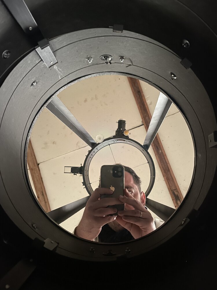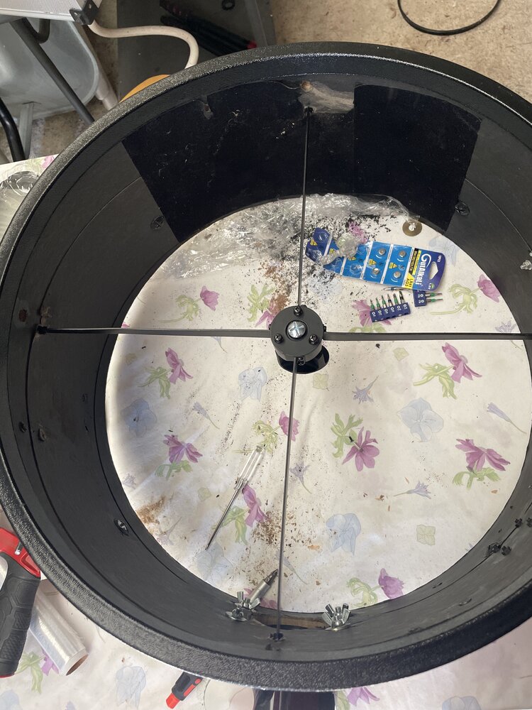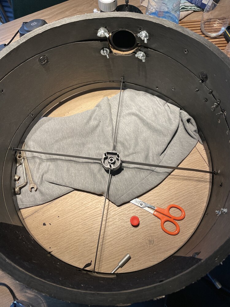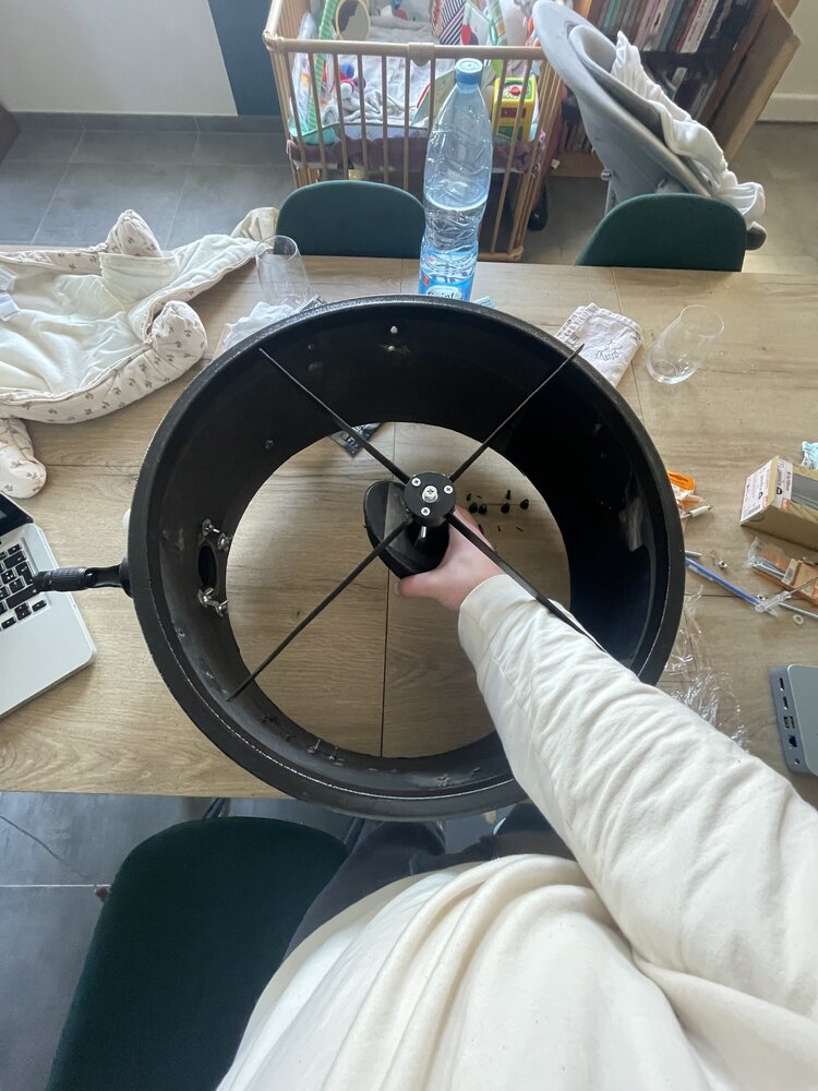 Salut tout le monde ! L’aventure du 400 continue. Comment ça ? Ce n’était pas de l’histoire ancienne ! Et bah, oui et non. Après ma dernière soirée d’observation, les observations effectuées étaient correctes mais pas exceptionnelles. Qu’est ce qu’on fait dans ces cas là ? On va demander de l’aide chez les mêmes copains que d’habitude sur Discord. Et apparemment, les problèmes sont un peu plus conséquent qu’il n’y paraît. Mais rien d’insurmontable ! Rappelez vous que je n’avais jamais touché réellement au primaire en 5 ans avant la dernière fois. Le soucis ici ? Un secondaire qui n’en fait qu’à sa tête et impossible à bloquer, malgré l’achat d’écrous auto bloquants. Ça ne veut pas. Autant vous dire qu’observer dans ces conditions semblent compromises. La solution ? Enlever le miroir primaire de son support bricolé (j’y reviendrai) et un changement d’araignée. Du boulot ? Y’en a à revendre et cela me fait un peu peur. On passe donc commande d’une araignée et d’un support de secondaire, reçus rapidement dans la semaine, c’est cool. Avoir les pièces, c’est bien. Bricoler c’est mieux ! Mais alors, c’est un changement d’araignée, récupération et recollage du secondaire et en avant ! Haaaaa, cela aurait été tellement si facile, presque pas marrant. J’ai donc commencé par démonter l’ancienne araignée assez facilement et comme ce télescope n’est pas fait comme les autres, l’ancien propriétaire avait eu l’idée saugrenue, dans son montage de fixation du secondaire de mettre une longue tige centrale pour que le secondaire soit aligner avec le PO. Pas de ça ici messieurs dames ! C’est une araignée et un support classiques. Me voilà joyeusement en atelier pour récupérer ma perceuse ! Ça va trouer. Mais avant ça, car ce n’est pas à faire sur un coup de tête, mon fidèle mentor (exceptionnel d’ailleurs. Je tiens sincèrement à la remercier. J’apprends énormément à tes côtés) me faire prendre le secondaire libéré de son ancienne structure (j’y reviens, encore une sacrée aventure pour cette partie), me le fait placer ce qui est censé être au centre et me le fait avancer vers le PO, je détermine un nouveau centre et mesure l’écart entre le dos du secondaire et celui de son support. STOP ! On va donc percer quelques centimètres plus bas pour pouvoir insérer ta nouvelle araignée. Un tube de structure souple, ça devrait aller. Que nenni ! L’épaisseur du carton ainsi que la feutrine côté intérieur du tube me rendent la vie difficile. C’est un carnage sur la cage. Qu’est ce que je suis entrain de faire ! Le carton dégueule et ne me permet pas d’insérer convenablement ma nouvelle araignée. Ha oui, petite précision, des vis M2, si tu forces trop, ça foire plus vite que ton ombre, je m’étais retrouvé 2 jours plus tôt à arpenter les brico, et même un opticien mais sans succès. « Merci » le web. Pris de panique, mon mentor me guide sans trembler. Va falloir foutre de la colle dans chaque trou nouvellement formés, attendre et repercer cela au propre. Bah oui, je veux bien mais je veux avancer. Petit coup de ponceuse, énorme combat pour mettre les vis M2 (essayer d’utiliser un tourne vis sur une surface arrondie et sans marge, vous allez vous marrer) et une araignée enfin fixée ! Je me vois avancer, quel plaisir. Fixer son araignée, c’est bien, y mettre un miroir, c’est mieux. Revenons donc un peu en arrière. Décoller un miroir, en soit, ne devrait pas poser de problème, un coup de cutter sur quelques points de colle et c’est tout bon. Effectivement, mais vous vous doutez bien que mon achat n’est pas comme les autres. L’ancien propriétaire avait mis du silicone sur L’ENSEMBLE du support du miroir. J ai donc scié en utilisant le peu de muscles que j’ai pour libérer le secondaire. Étape réussie. Je reprends donc contact avec mon mentor qui me parle d’offset. Attendez, ce n’est pas uniquement en photo ? Et bien non, on va devoir trouver le point permettant au laser de collimation de taper dans ce fameux nouveau point. « Chérie, tu peux m’aider à réaliser un patron et faire 2/3 calculs ? » Offset trouvé, laser qui tape ! Attends une minute, y’a un problème, si je veux que le laser tape, le secondaire touche l’araignée ou ne touche pas l’intégralité du support. Panique à bord ! Vite résolue car j’avais mis le point vers le haut et non vers le bas. Problème résolu ! Stop pour l’instant. Restera l’étape fastidieuse du collage, je touche au but. Non sans mal mais j’y arrive. Quelle expérience engrangée en si peu de temps, je vais connaître mon tube par cœur et je ne le lâcherai pas de si tôt ! Hâte de coller le miroir. Quelques photos de mes travaux