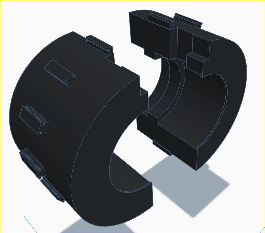 Bonjour, Afin de fixer divers petits accessoires sur mon train optique, j'ai entrepris la création d'une sorte de caisson qui se fixerait autour de la webcam et de la bague de fixation à l'objectif. En deux demi-coquilles et munie d'une série de rails tous les 30 degrés, afin de pouvoir y attacher lesdits accessoires. Les deux rails supérieur et inférieur servent également de verrous. Je me suis ensuite demandé s'il ne serait pas plus judicieux de prévoir des ouïes d'aération pour la caméra, qui n'est pas refroidie. D'autant plus que j'ai dernièrement acquis un petit module de refroidissement à fixer à l'arrière de la caméra. Sur la représentation ci-dessous, de g. à d. : gris cendre : la bague intermédiaire de fixation à l'objectif, gris sombre : la bague de fixation de la caméra, rouge : la caméra et bleu : le module de refroidissement. Le tout assemblé dans le caisson vu en coupe donne ça : La turbine du module est bien dégagée à l'extérieur. Lors de mes tests, module simplement posé sur la caméra, j'ai noté une condensation non négligeable. Cela représente-t-il un risque pour le matériel dans ma conception telle qu’actuellement ? Des évidements entre les rails de fixation, autour de la caméra, sont-ils ou non utiles ou indispensables ? Merci pour vos retours et conseils avisés.