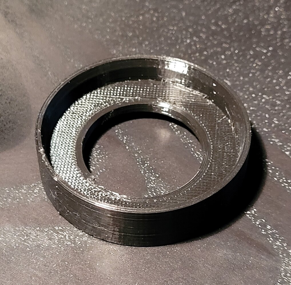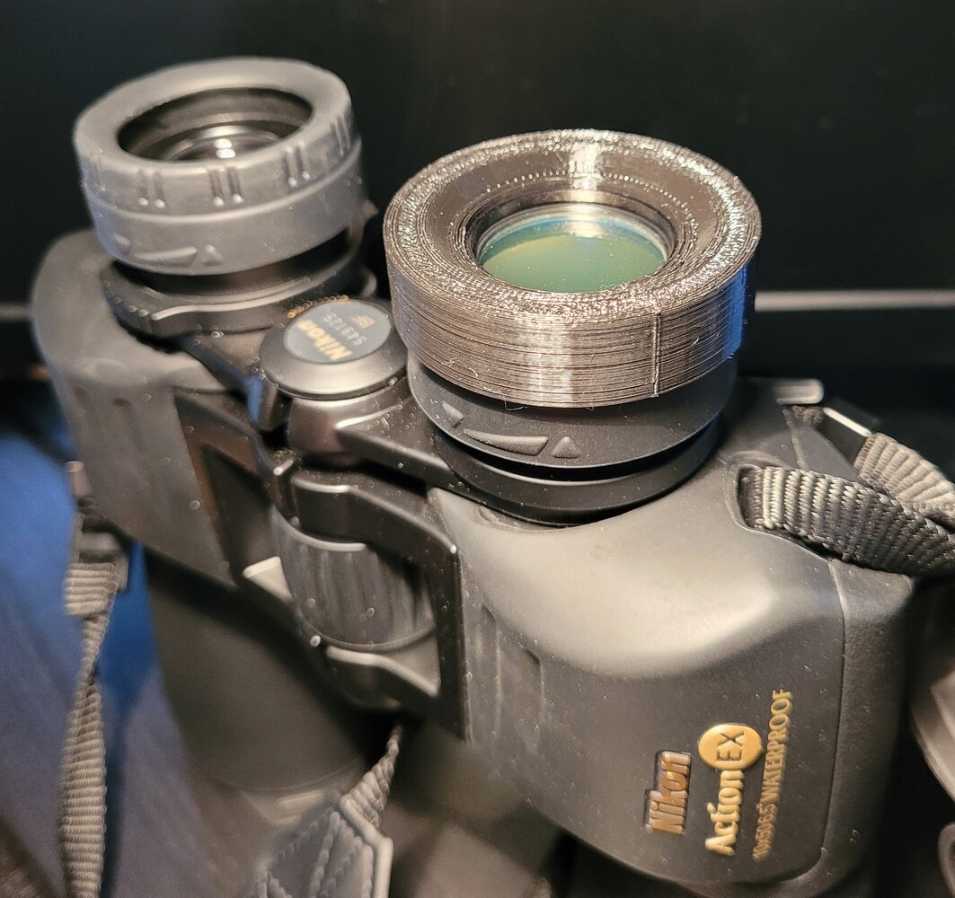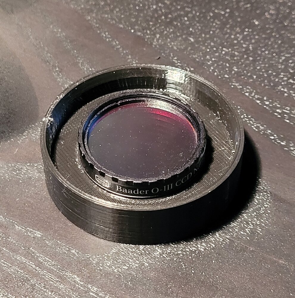 Bonjour, bonsoir, Après avoir remarqué qu'un filtre 1.25" (31.75mm) tenait presque parfaitement dans les bonnettes de mes jumelles Nikon Action EX 10x50 : j'ai conçu une pièce à imprimer en 3D pour tenir le filtre et qui viendrait tenir sur les bonnettes des jumelles : Le filtre se caler simplement dans le trou central et tient sans avoir besoin de le visser. Puis la pièce vient se loger par dessus la bonnette (qu'il faut lever d'un cran). Le tout tient bien même en penchant la pièce vers le bas. Si jamais cela ne tient pas, on peut ajouter un peu d'épaisseur de scotch. Cela tient bien et cela fonctionne bien, la vue est bonne, pas de soucis de mise au point ni de placement de l’œil. Je vous laisse le .stl . Vous pouvez le modifiez autant que vous voulez. Support filtre 1.25 jumelles Nikon Action EX.stlSupport filtre 1.25 jumelles Nikon Action EX.stl Pour l'impression j'ai fait en PETG, remplissage 100%, épaisseur de fil de 0.2mm En espérant que ce soit utile Paul