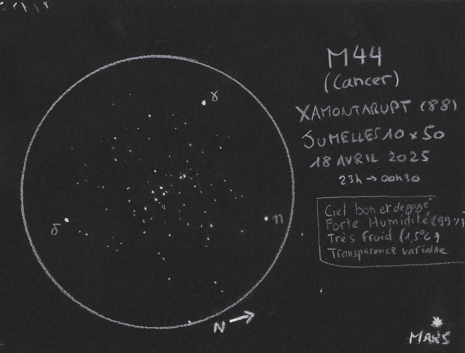 Bonjour, bonsoir Je vous partage mon tout premier astrodessin fait le 18 avril 2025 depuis les Vosges, dans une nuit presque glaciale. C'était aussi ma première sortie sous un bon ciel de ma nouvelle paire de jumelles Nikon Action EX 10x50, donc je vous offre aussi un petit CROA. Mais d'abord une petite présentation : je fais de l'astro depuis quelques années déjà (et je suis en train de faire mes études dans ce domaine, du côté de l'ingénierie optique) et je me focalisais surtout sur l'astrophotographie, à la petite lunette de 50mm et au newton de 200mm. L'observation a toujours été secondaire, ayant vécu jusqu'à il y a très peu de temps en région parisienne, où sa pratique est difficile.. J'ai pu quand même avoir de belles expériences d'observation avec mon 200 lors de voyages loin de Paris (Triangle Noir du Quercy, les Alpes, les NCN, etc..) et j'ai pu parfois finir par faire de l'observation quand le matériel astrophoto ne fonctionnait pas. Mais je n'ai jamais eu plus d'intérêt que ça. Cependant, ces derniers temps, faute de temps, parfois d'énergie, l'astrophoto est devenu difficile à pratiquer et j'ai eu envie d'aller vers une pratique un peu plus simple comme l'observation. Je me rend compte aussi que je garde plus de souvenirs et de bonnes impressions de nuits d'observation que de nuits de photo (sûrement parce que en observation on est actif, on voit des choses, on s'émerveille directement alors qu'en photo, on s'énerve à mettre en place et puis quand c'est lancé on part faire autre chose.. et l'émerveillement vient quand on a tout bien traité plus tard). J'ai donc investi dans une belle paire de jumelles, les Nikon Action EX 10x50, comme premier instrument 100% visuel, afin de facilement observer où je veux, quand je veux. Peut-être à l'avenir un dobson viendra compléter ma collection.. En attendant de beaux jours et les vacances, j'ai passé beaucoup de temps à lire des CROA, et à voir qu'on pouvait vraiment voir beaucoup de belles choses. Aussi j'ai fini par tombé sur des astrodessins, offrant un moyen de partager ses observations et garder une trace durable, comme l'astrophoto ! Aussi, cela donne une vue proche de ce qu'on peut observer ce qui est assez difficile à partager aux non initiés à l'observation. J'ai donc eu l'envie de m'y mettre et j'ai lu une bonne partie des 2 magnifiques livres "Astrodessin", que j'ai emprunté à un ami. Ce sont vraiment de superbes livres que je ne peux que recommander ! Très inspirant. Maintenant place au dessin ! J'étais pour Pâques en vacances chez ma parents dans les Vosges. J'ai pu observer depuis la terrasse de la maison, bien placée, assez isolée, loin de l'éclairage du village. Le temps était bon, mais il faisait froid et humide (5°C vers 22h et 1.5°C en fin d'observation vers 3h). La transparence du ciel était assez variable avec ce niveau d'humidité. Le ciel correspond à du bortle 4, les montagnes cachent les pollution lumineuses mais elles restent légèrement présentent. Je n'avais avec moi que mes jumelles et j'ai découvert vraiment l'observation avec celles-ci (je les avais testé rapidement deux fois, mais près de Paris, ce qui n'avait pas été très concluant, et avant cela je n'avais quasiment jamais observer le ciel dans des jumelles). J'avais avec moi un trépied, une chaise longue confortable et pour le dessin, ma copine m'a offert un carnet de feuille à dessin noir et un jeu de crayon et feutre blanc. Le dessin sera réalisé avec 2 crayons blancs. J'ai décidé de partir sur une cible simple, remplissant le champ des jumelles, l'amas ouvert M44. L'amas été facilement visible à l’œil nu en vision direct au milieu du Cancer bien visible plein Sud (constellation invisible depuis chez moi en région parisienne 🥲). Mars était proche et bien brillante avec sa jolie teinte orangée. Tellement proche que je l'ai mise sur le dessin hors du champ marqué avec le cercle blanc. Il m'aura fallu 1h30 (23h à 1h30) pour réaliser le dessin, debout, jumelles sur le trépieds et feuille de dessin au coin du bras tenu sur une planche. Je n'avais pas vraiment préparé le dessin, c'était donc très expérimental. Heureusement avec les 6.5° de champ des jumelles , l'amas était encadré par 3 étoiles brillantes de la constellation du Cancer, me permettant d'avoir des repères. J'ai commencé par placer les étoiles les plus brillantes, notamment le "carré" au centre de l'amas, puis zones par zones je plaçait les étoiles que je voyais, d'abord en vision direct, puis en vision indirect. Le plus difficile étant d'avoir les bonnes proportions, menant à des erreurs sur le dessin. Mais j'ai évité de trop effacé car cela marquait beaucoup le papier. Finalement j'ai réussi à placer presque tout ce que je voyais. Il semble que les étoiles que j'ai placé descendent jusqu'à la magnitude 9 - 9.2. A noter qu'aucune nébulosité n'était visible, je ne voyais que des étoiles. Le dessin a été scanné au scanner et j'ai fait quelques retouches sur Photoshop pour enlever les traces de gommages. Après avoir fini mon dessin, les jumelles commençait à avoir pas mal de buée. J'ai donc sorti le sèche-chevaux pour pouvoir les sécher et continuer la soirée. A l’œil nu, Jupiter se couchait vers l'Ouest, Mars était encore bien haute, proche de la grosse tache qu'est M44, toujours bien visible. Dans la Chevelure de Bérénice, Melotte 111 apparaissait comme une grande nébulosité en vision directe, mais dont on discerné la nature de regroupement d'étoiles en vision indirecte. Avec les jumelles, et aider de l'Atlas des Constellations, j'ai parcouru le ciel d'ouest en est. D'abord, sous M44, j'ai pu voir M67 comme une grosse tache sans définir les étoiles. Dans le Cocher, au dessus de Jupiter, dont j'ai pu voir 3 satellites, j'observe 3 taches bien alignées et régulièrement espacées. Ce sont M37, M36 et M38, qui se ressemblent pas mal au jumelles. Et M35 et vis