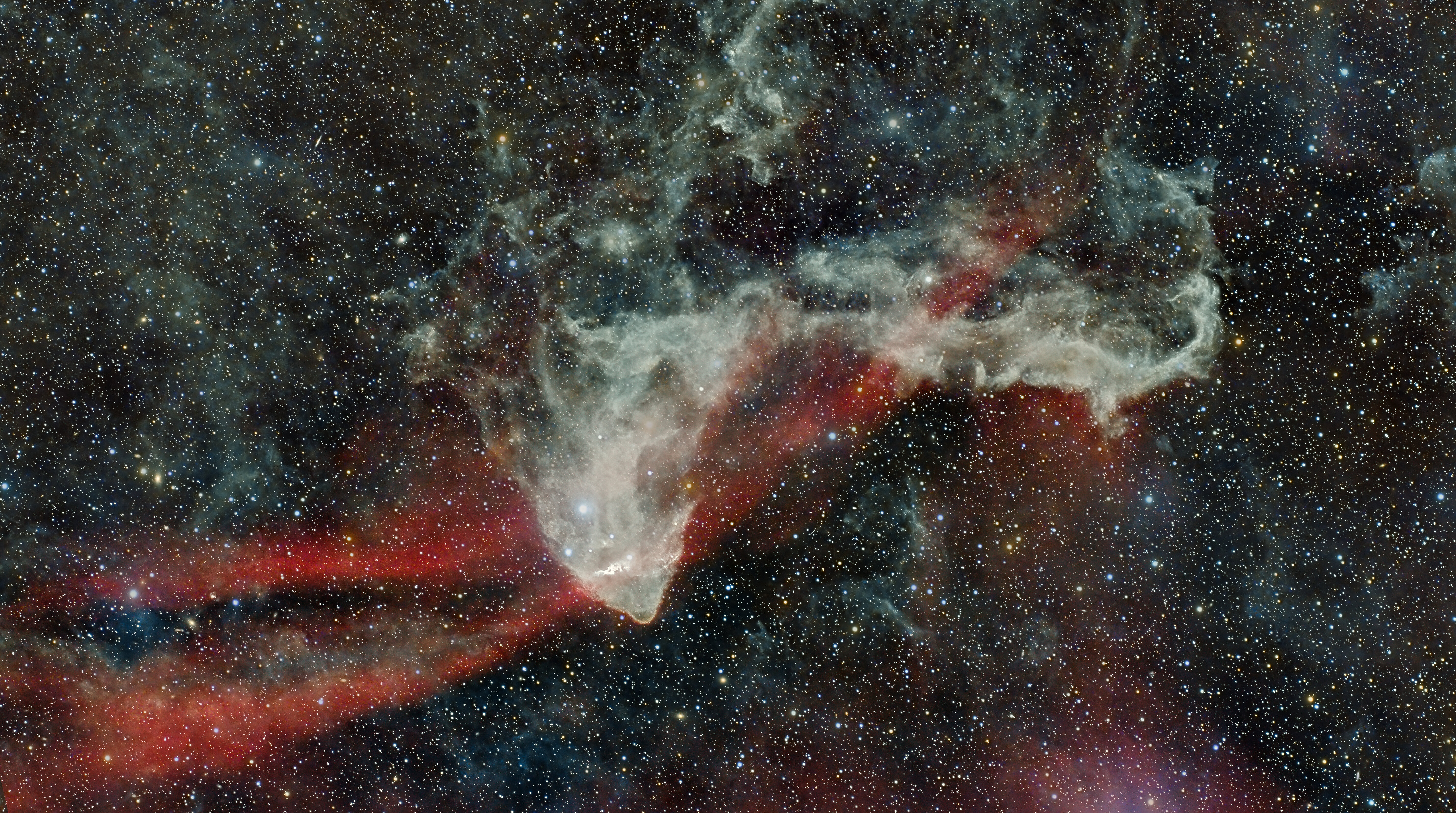 Après la nébuleuse de la tête de cheval, voici la version 2025 de la nébuleuse du sorcier. Cette image est plus difficle à traiter car il y a beaucoup d'étoiles... Riche en hydrogène alpha et oxygène III, elle se prête bien a une version en HOO. Pour augmenter le réalisme des étoiles, j'ai repris les étoiles de la version RVB et pour améliorer le rendu de la version HOO j'ai ajouté un peu de rouge de la RVB dans la couche H et un peu de bleu de la RVB dans la couche O. La photo intègre un temps de pose de 6h15. Voici les détails techniques : Lunette Askar FRA500 (F500/D90) Monture Celestron AVX Mise en station QHY PoleMaster Guidage ZWO120MM OAG + PHD2 Focuseur Pegasus FocusCube 2 Pilotage monture et Séquenceur : NINA Prise de vue par caméra ZWO ASI 2600 MC PRO (gain 101, Température - 10°C, Offset 50) Filtre Antlia HaOIII Lights 58x180s (RVB), 40x300s (HaOIII), 50 DOF Empilement et prétraitement SIRIL Traitement PixInsight, BlurXterminator et Noise Xterminator Post-traitement Luminar NEO