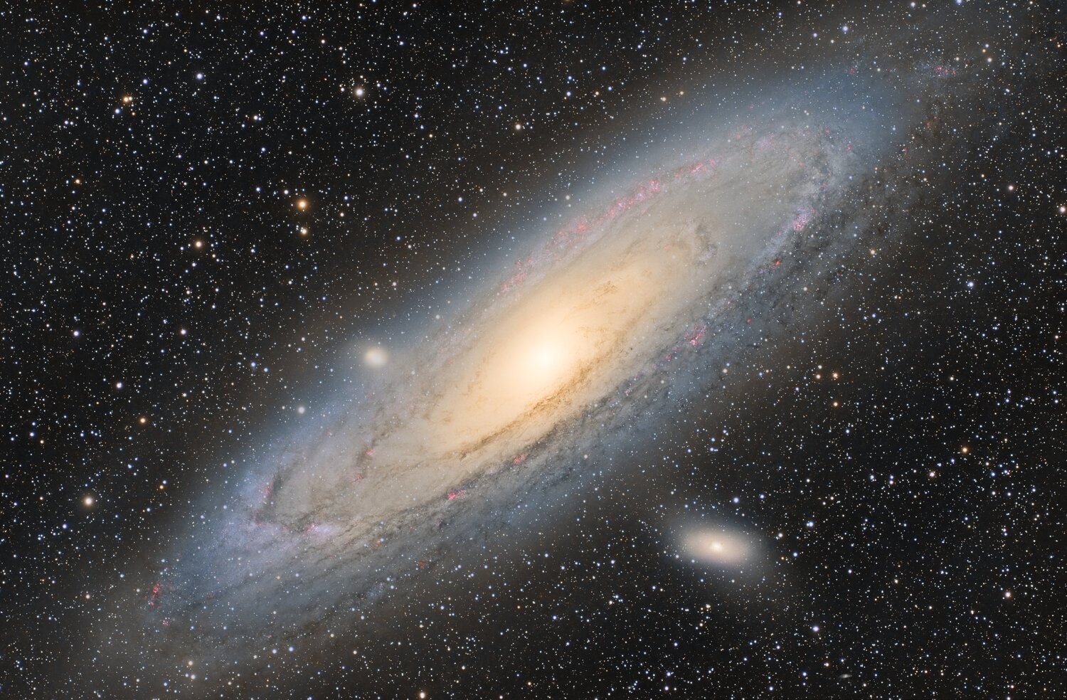 En matière d'astrophoto, il y a des objets que je photographie tous les ans pour voir comment je progresse dans la prise de vue et le traitement. La galaxie d'Andromède (M31) est l'un d'eux. Cette galaxie est fascinante car elle est la galaxie spirale la plus proche de nous (2,55 Millions d'années lumière). De plus, elle se raproche de nous à la vitese de 120 km/s. La fusion avec la Voie Lactée devrait intervenir dans 4 Milliards d'années... On a le temps de voir venir ! Les masses d'Andromède et de notre galaxie sont comparables mais Andromède est plus lumineuse et contient plus d'étoiles. La photo que je vient de faire intègre une couche d'hydrogène alpha qui apporte beaucoup de détails et d'esthétique à la photo... Il s'agit d'une photo classique mais pas si facile à faire et à traiter. Je pensais pouvoir la réaliser entièrement depuis Pénestin. Malheureusement, le ciel en a décidé autrement et je n'ai pu faire en Bretagne que la version H alpha (on était à l'époque de la pleine lune). La couche RVB a été faite à Laval mais je n'ai pu passer que deux nuits sur cette cible. Du coup, le temps d'intégration total est supérieur pour la couche H alpha (8h20) que pour la couche RVB (8h) ce qui est paradoxal et influence probablement le rendu final. J'ai essayé de faire un taitement le plus doux possible mais le fond de ciel est trop sombre ce qui est un peu dommage mais je n'ai pas pu corriger ce problème sans déséquilibrer le reste de l'image. détails techniques : - Lunette Askar FRA500 (F500/D90) - Monture Celestron CGX - Mise en station QHY PoleMaster - Guidage ZWO120MM OAG + PHD2 - Focuseur Pegasus FocusCube 2 - Pilotage monture et Séquenceur : NINA - Prise de vue par caméra ZWO ASI 2600 MC PRO (gain 101, Température - 10°C, Offset 50) - Filtre Antlia HaOIII (pour la couche Ha) - Lights 100x300'' (Ha), 161x180'' (RVB) 50 DOF - Empilement et prétraitement SIRIL - Traitement PixInsight, BlurXterminator et Noise Xterminator - Post-traitement Luminar Neo