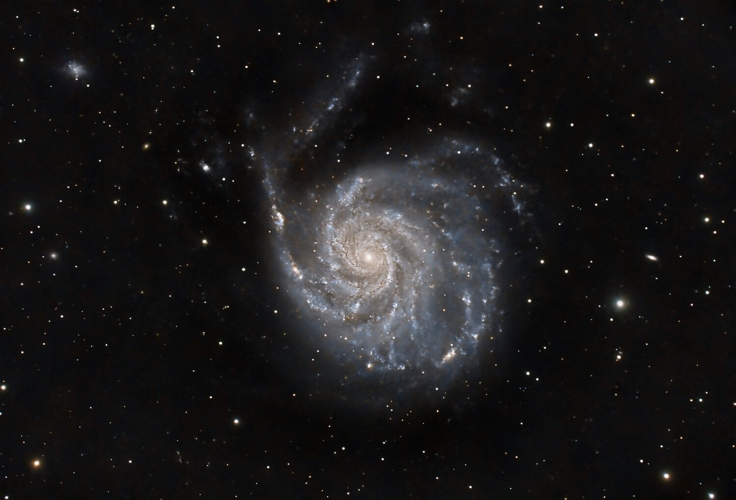 Bizarrement, sur ma version de Pixinsight, la colorimetrie par photométrie est systématiquement en échec. Alors qu’elle fonctionne parfaitement sous Siril. Mais la colorimetrie de Siril ne me donne pas de résultat suffisamment contrasté. Du coup j’essaye d’améliorer soir PI en alignant les couches et augmentant la saturation sur la starless. C’est un traitement au jugé qui, du coup, est différent à chaque fois. Mais je suis d’accord que le résultat manque de naturel principalement par ce que j’ai voulu décaler la couleur vert le bleu pour coller aux images habituelles de M101. Mon résultat initial était plutôt vert… Je vais réessayer un traitement moins invasive sur les couleurs car l’image a effectivement un gros potentiel et qu’elle le mérite.