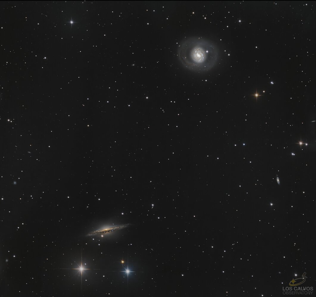 NGC 1055 & M77 cette fois retour sur des galaxies.... La grande galaxie spirale NGC 1055 (en bas à gauche) se joint à la spirale M77 pour former ce paysage cosmique en direction de la constellation de la Baleine. L’aspect étriqué et poussiéreux de NGC 1055, vue par la tranche, contraste avec celui de M77, vue de face, ce qui permet d’apprécier son brillant noyau et ses bras spiraux. Dépassant toutes deux les 100 000 années-lumière de diamètre, ces galaxies forment le couple dominant d’une petite meute de galaxies située à quelque 60 millions d’années de distance. À cette distance estimée, M77 est une des entrées les plus lointaines du catalogue de Charles Messier et est séparée de sa semblable NGC 1055 par au moins 500 000 années-lumière. Le champ couvre sur le ciel à peu près la même superficie que la pleine Lune NGC 1055 NGC 1055 est une galaxie spirale barrée relativement rapprochée et vue par la tranche et située dans la constellation de la Baleine. NGC 1055 est une galaxie de type morphologique Sab, située à une 50aine d’années-lumière. La classe de luminosité de NGC 1055 est II et elle présente une large raie HI. De plus, c'est une galaxie LINER, c'est-à-dire une galaxie dont le noyau présente un spectre d'émission caractérisé par de larges raies d'atomes faiblement ionisés et elle est aussi une galaxie active de type Seyfert 2 (Sy 2)1. Son bulbe proéminent est traversé par une large et sombre bande de poussière. Son trou noir central est supermassif, de l’ordre de 10millions de masses solaire M77 M77 est une galaxie dotée d'un noyau actif qui est caché aux longueurs d'onde visibles par un nuage de poussière interstellaire. C'est une galaxie de Seyfert de type 2, situé à une 40 d’années-lumière. C’est une galaxie de type morphologique (R)SA(rs)b. La notation (R) au début signifie que la galaxie est entourée d'un anneau extérieur.. Le trou noir supermassif au centre de la galaxie est entouré par deux disques de gaz qui tournent en sens inverse l'un de l'autre, phénomène très surprenant à l'échelle de quelques années-lumière9. La galaxie M77 est vraisemblablement la source de certains neutrinos détectés par l'expérience IceCube. Publié en 2010, grâce aux observations du télescope spatial Hubble, on a détecté un disque de formation d'étoiles autour du noyau de NGC 1068. La taille de son demi-grand axe est estimée à 1190 pc (~3880 années-lumière). Full et détails on astrobin : https://astrob.in/full/9np6xo/0/