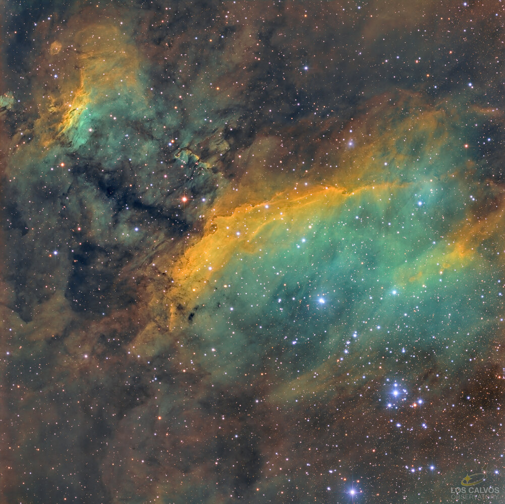 Au sud d'Antarès, dans la queue de la constellation du Scorpion riche en nébuleuses, se trouve la nébuleuse par émission IC 4628. Les étoiles massives et chaudes proches, âgées de quelques millions d'années, irradient la nébuleuse de leur lumière ultraviolette invisible, arrachant des électrons aux atomes. Les électrons finissent par se recombiner avec les atomes et produisent à cette occasion un rayonnement qui rend la nébuleuse visible. Située à une distance estimée de 6.000 années-lumière, la région présentée ici s'étend sur quelque 250 années-lumière de large et l'équivalent de trois Pleine Lune dans notre ciel. Cette nébuleuse est également connue sous la référence Gum 56, d'après l'astronome Australien Colin Stanley Gum. Mais les astronomes appréciant les fruits de mer connaissent sans doute mieux ce nuage cosmique sous le nom de Nébuleuse de la Crevette…. L’image est en SHO et palette Hubble. Full & Details Astrobin : https://astrob.in/b15lrx/0/