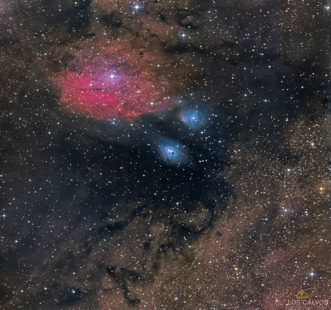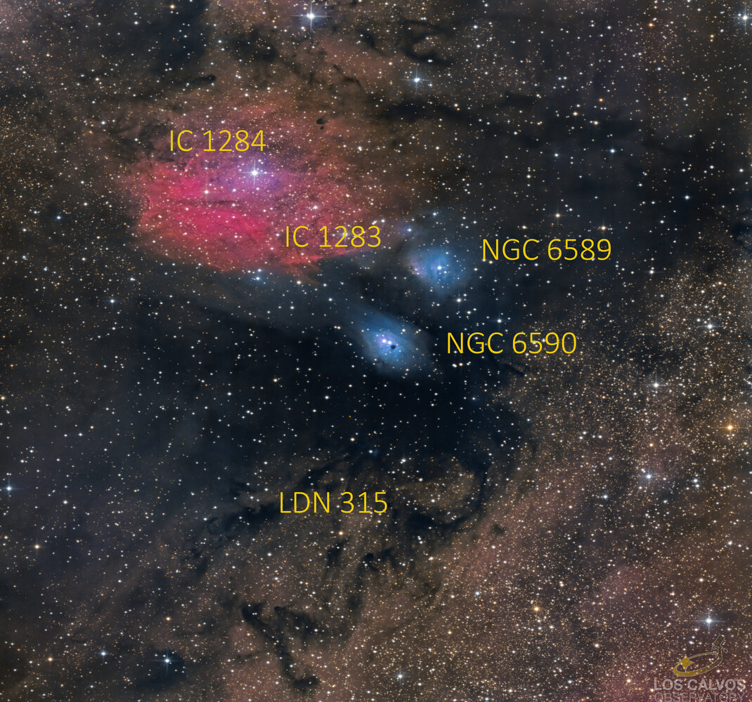 bonjour, les cieux n'étant pas très cléments au Chili ces derniers temps, nous nous sommes rabattus sur une cible plus commune : IC 1284 est une nébuleuse en émission située dans la constellation du Sagittaire. Cet objet du ciel profond se trouve très près du Petit Nuage d’étoiles du Sagittaire (en bas à droite) (M24) le long du plan de la Voie lactée. Bien que IC 1284 soit petit, il s’agit d’une région H II plutôt brillante. La lumière de cette nébuleuse parvient à passer à travers un espace vide dans le nuage sombre de la nébuleuse LDN 291 environnante. IC 1284 est située à environ 5 540 années-lumière de la Terre dans le bras du Sagittaire de la Voie lactée.Il y a deux nébuleuses par réflexion bleue près de la nébuleuse d’émission IC 1284. Ces objets sont désignés par NGC 6589 et NGC 6590. Il y a aussi une nébuleuse sombre qui traverse cette zone du ciel nocturne, cette nébuleuse est cataloguée comme LDN 315. l’image est dans LHa-RHa-G-BOIII Full&details on astrobin : https://astrob.in/pcy2nm/0/
