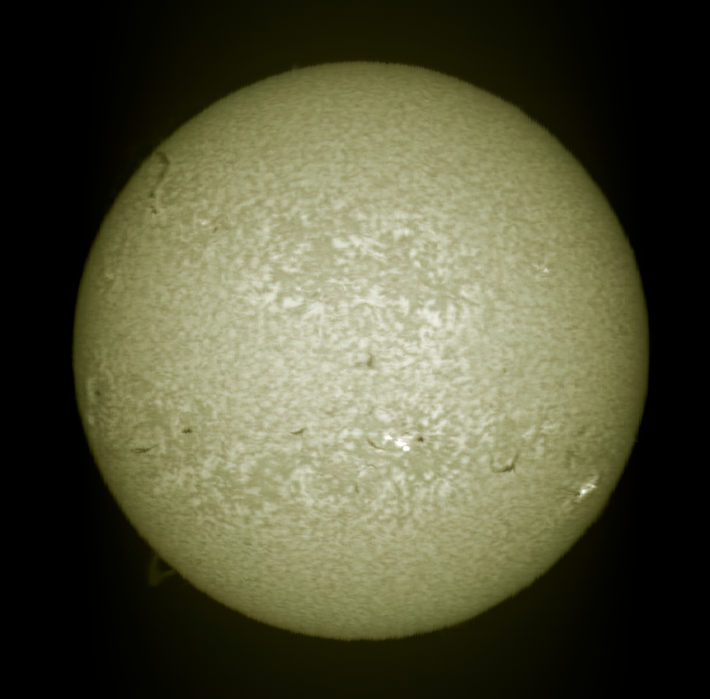 Bonjour, Sacré activité ce jour,... J'ai d'abord commencé avec le Quark Daystar sur la Bresser 150/1200 et ASI 432 MM et ensuite j'ai monté le Sol'Ex sur la TS 60/360 et ASI 178 MM, mais avec l'arrivée des nuages, j'ai pas eu le temps de peaufiner l'image et ça se voit. Mais ça permet quand même d'avoir une vision d'ensemble. Synthèse des meilleures prises avec 3 planches. Bon ciel à tous Philippe