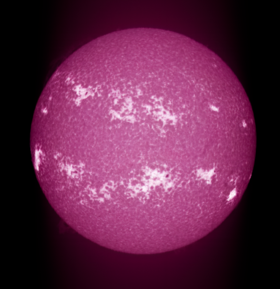Bonjour, Après les orages de ce matin et avant ceux de ce soir, une brève éclaircie entre 12h30 et 13h15. Juste le temps de mettre en route, et comme ça voulait le faire, j'ai fait le tour en H alpha, H beta et Ca H, plus le continuum. Une très belle activité avec de superbes protubérances, dommage de ne pas avoir eu le temps de faire des gros plans au bazooka ! ASI 178 MM sur Sol'Ex associé à une TS 60/360 montée sur HEQ5 Pro. Acquisition SharpCap 4.0 Traitement INTI et PhotoShop Pour commencer le Continuum près de la raie C a H (le meilleur de 3) Plus la traditionnelle image en H alpha Moins souvent présente, l'image en H béta la plus difficile à mettre au point car très lumineuse. Puis la Raie Ca H et pour finir les protubérances en H alpha (elles sont aussi bien visibles dans les autres raies). Bonne fin de journée et bon ciel Philippe-