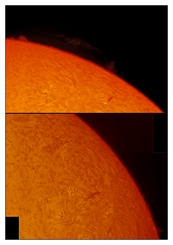 Bonjour, Très turbulent ce matin entre les nuages, mais le spectacle était pas mal Disque complet au Sol'Ex sur SW ED Et les détails au Quark Chromosphère sur Bresser 150/1200 Bon ciel Philippe