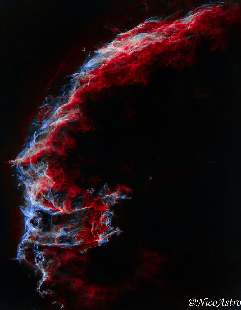 Je vous présente NGC 6979. C'est une toute petite partie des dentelles du cygne (dans cette même constellation bien sûr) que l'on nomme le triangle de Pickering. Cette image a été réalisée sur 2 nuits en HOO : Rouge : hydrogène, vert : Oxygène et bleu Oxygène. Pour changer des autres images, j'ai choisi une version légèrement orangée. Les infos et exifs sont disponibles ici : https://www.astrobin.com/0wrfw1/ Nico Hoo signé tiff.tif