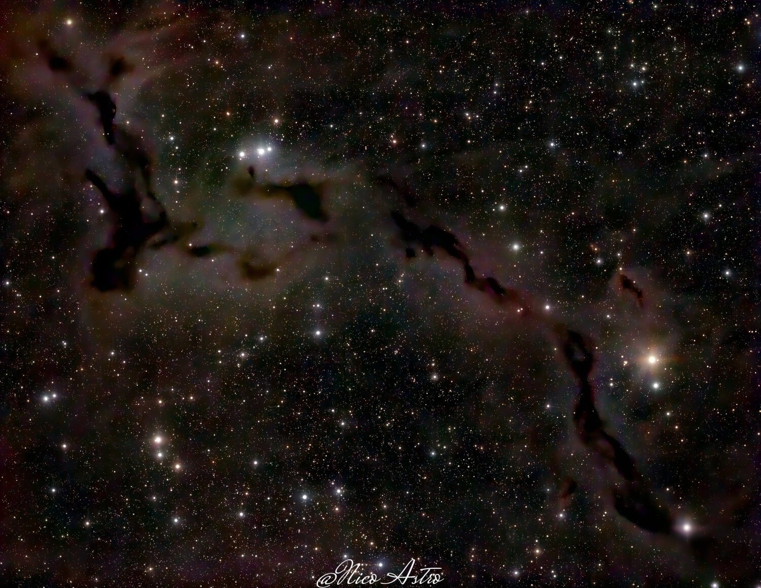 Je vous présente ma première image en LRVB, celle de Barnard 150, également surnommée la Nébuleuse de l’Hippocampe. Elle est située dans la constellation de Céphée à 1200 années lumière. C'est une nébuleuse obscure que l'on reconnaît par des motifs complexes de poussière et de gaz. Pour cette image, j'ai effectué une intégration de 7h22, dont presque 3h30 de Luminance A savoir: Cette nébuleuse est située tout prés de NGC 6946, aussi nommée la galaxie du Feu d'artifice. Je suis vraiment content de l'APO120! Les exifs et détails sont disponibles ici: https://telescopius.com/pictures/view/201363