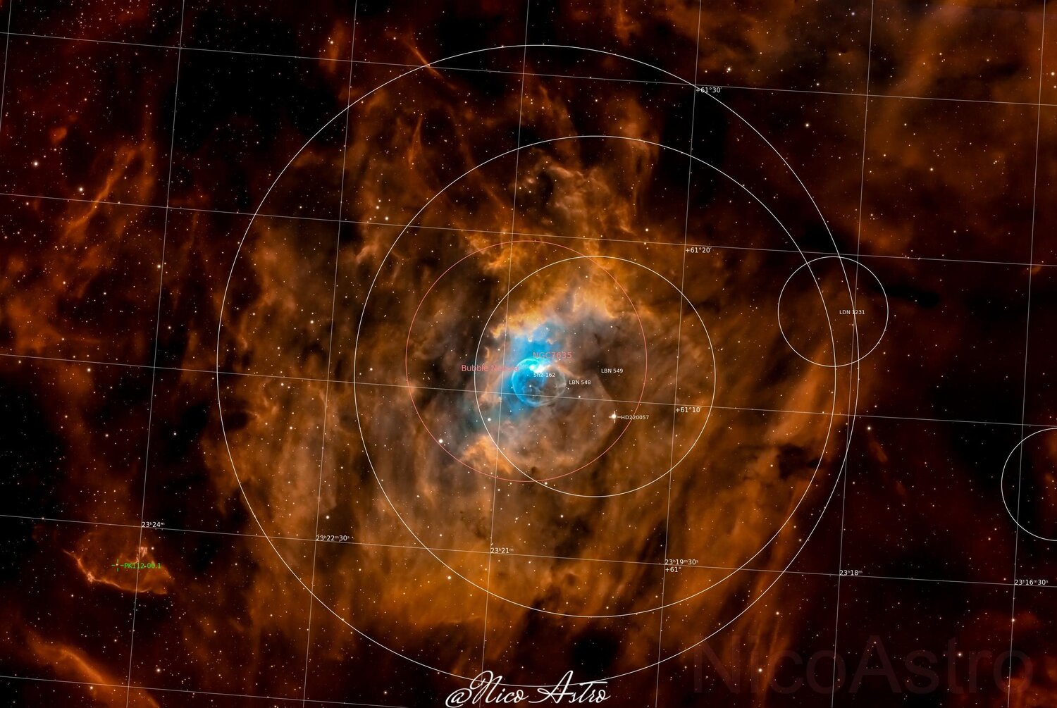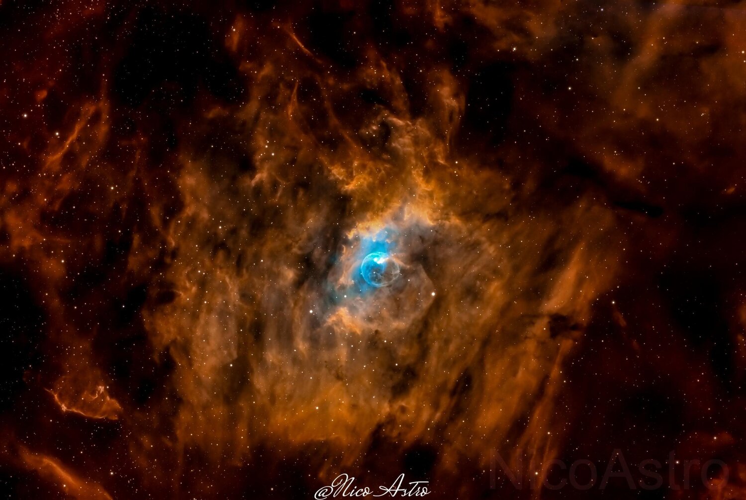 NGC 7635, aussi nommée la nébuleuse de la Bulle où Caldwell 114, est une nébuleuse en émission située dans la constellation de Cassiopée. Reprise de cette image réalisée en SHO (Palette Hubble) avec 19h15 d'exposition 🔭 Askar APO120 📷 ZWO 1600MM PRO ⌚ Ha 75X5Min OIII 65X5Min SII: 91x5Min Total: 19h15. ⚙️ GapXpert, PIX Version full sur Astrobin: NGC7635 SHO