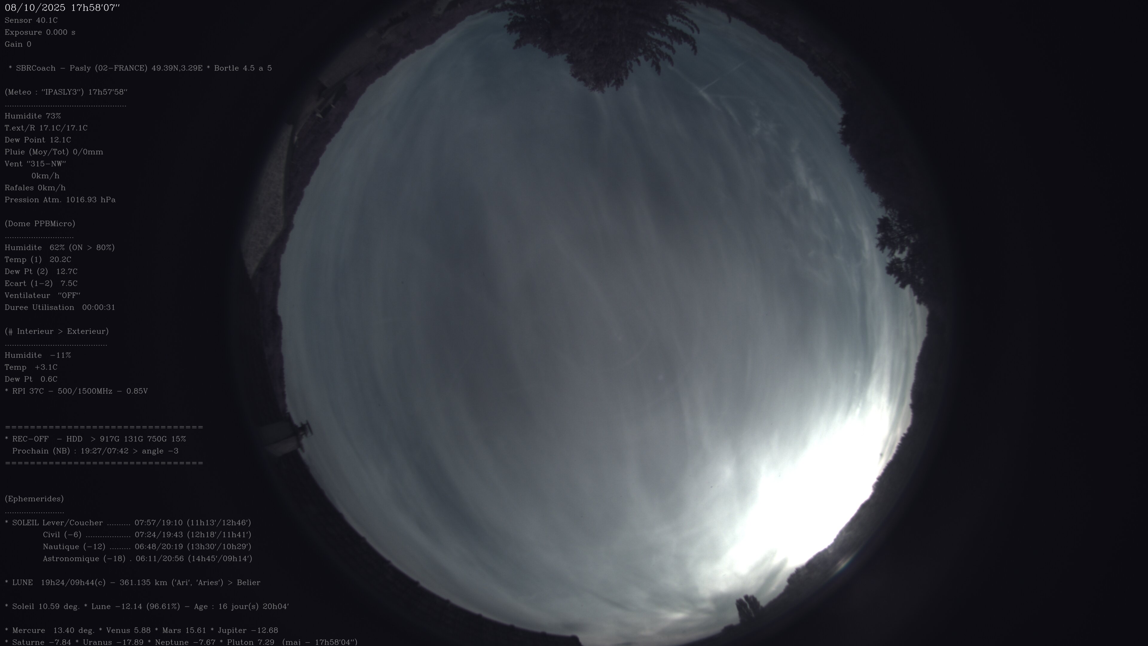 Les aurores ont commencè ici en Picardie (Soissons) vers 02H52 , mais malheureusement , voiles et passages nuageux, La Lune était déjà levée, ça a gâché le phénomène ! jusque vers 05H00 ensuite les Lampadaires mis la touche finale ! Bien Sympa quand même mais on est très loin de celles du 11 Mai 2024 viewtopic.php?p=179901#p179901 On devient exigeant et "blasé" non ! Je remettrais un mat pour la nuit prochaine ... au cas ou ! *** La Vidéo de la AllSKY pendant cette aurore allsky-20251211.mp4