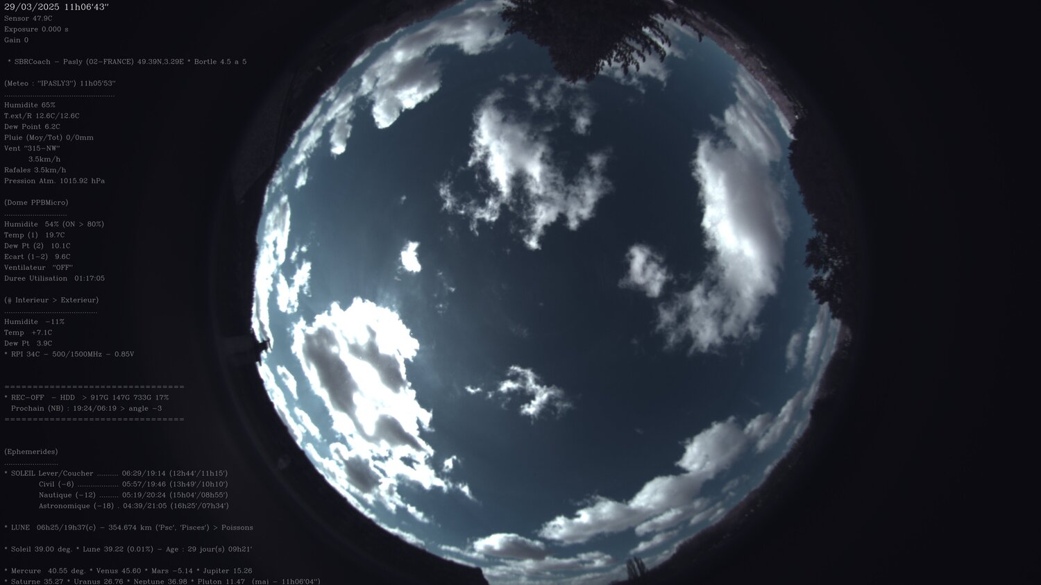 Beaucoup de passages nuageux, donc Timelapse « nettoyé » des sauts et autres où l'on voyait rien, et un passage d'avion. ==> TIMELAPSE visible sur le lien LIENS TIMELAPSE ==> https://youtube.com/shorts/6aFgrqGqYK0?feature=share- 2 réponses