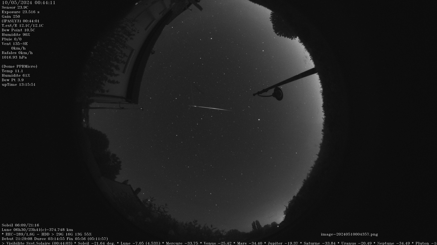 Bolide, nuit du 09 au 10 Mai 2024 En plein test (au Raz du sol, pas encore mis sur le toit à la place de ma AllSky habituelle) avec ma nouvelle config, alors que j'étais en train de faire différents tests Gain / Exposition ... un joli bolide est passé Dommage ...