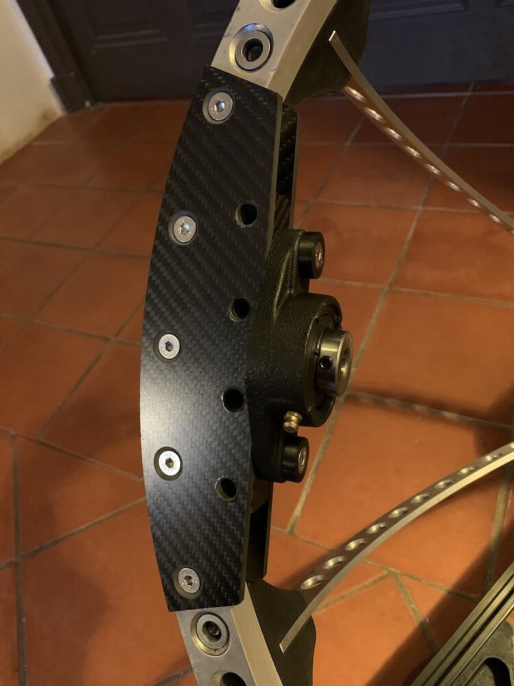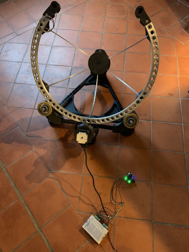 Bonjour à vous en ce samedi pluvieux ! Quelques nouvelles de l'entraînement AD de mon split ring. L'usinage de la poulie d'entraînement étant terminée depuis le week-end dernier, j'ai aujourd'hui usiné une gorge dans les galets de soutien du cercle. J'ai monté le câble diamètre 1.5 mm pour faire un essai avec le moto-réducteur NEMA-23 + Harmonic Drive HD42 de fabrication personnelle, déjà maintes fois montré plus haut. Au final tout a l'air de très bien marcher avec seulement une spire sur la poulie. En réglant la vis du tendeur, j'obtiens un couple bien suffisant pour entraîner la future charge (tube serrurier T-250). J'ai testé à la main le couple, pas de souci, il y en a et ça ne glisse pas. De plus, mon système de débrayage marche aussi, lorsqu'on dé-serre la vis du tendeur de 1 ou 2 tours, le câble glisse sur la poulie et on peut faire bouger le cercle; il y a une friction résiduelle qui est intéressante car cela permettra à l'ensemble de ne pas "piquer du nez" ! Je suis très satisfait ! Je vous poste quelques photos Demain, je posterai une vidéo qui permettra de se rendre compte du concept. -