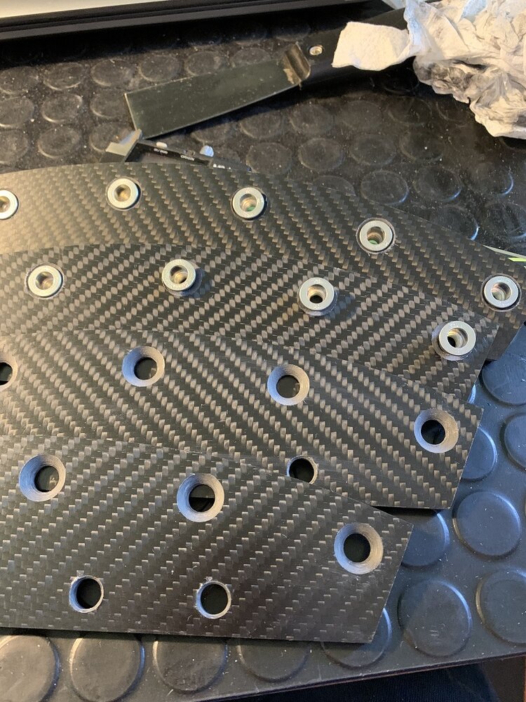 Bonjour les amis Aujourd'hui, j'ai fini par arrêter de procrastiner avec l'usinage des plaques carbone. Ce qui me faisait peur, c'est la poussière de carbone générée pendant l'usinage, donc je suis allé m'acheter un masque respiratoire avec filtre à cartouches 3M digne de ce nom et je me suis lancé. J'ai commencé par imprimer des gabarits en plastique pour m'aider pour les perçages et l'usinage. 1 - J'ai associé 4 plaques entre elles avec du scotch kapton large pour immobiliser les pièces les unes par rapport aux autres. 2 - masque sur le nez et lunettes de protection, perçage de 9 trous et vis de maintien pour ne pas que ça bouge, aspirateur pas loin pour la poussière 3 - découpage grossier le long des gabarits à la scie à métaux (la partie pénible, c'est long mais ça se fait bien) 4 - installation du plateau diviseur sur la fraiseuse et des 4 pièces 5 - usinage précis grâce au gabarit (encore) 6 - reperçage des trous à 9 mm pour pouvoir monter les inserts taraudés en acier 7 - chanfrein sur une face de 5 trous seulement pour noyer les têtes de vis et les têtes d'insert 8 - montage sur le cercle AD Assez content du résultat, va falloir que je fasse la même chose pour le deuxième télescope ... Quelques photos comme toujours. J'ai pas photographié toutes les étapes, mais ça donne une idée. -