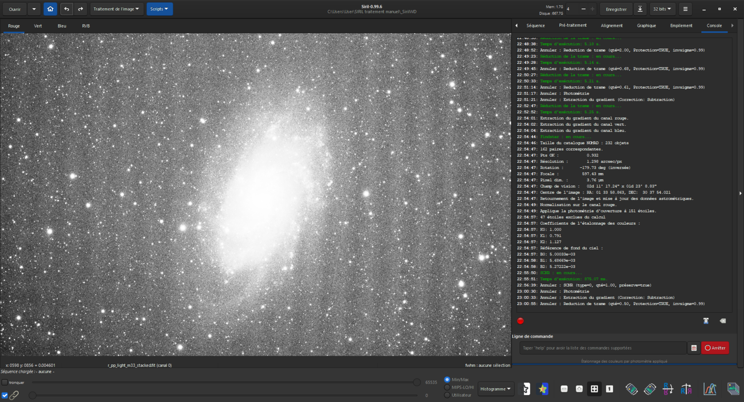 Bonjour, J'ai effectué une session sur M33 la nuit du 23/09/23 : 87 poses de 300s. 40 flats / 100 darks flat / 50 darks matériel : Monture Skywatcher AZEQ6 / caméra couleur ASI 2600 / askar fra 600 La séance a commencé à 10h00. La lune en était à son premier quartier et se couchait à 00h19 Ci-joint le résultat .fit de l'empilement des bruts (SIRIL 0.99.6). Quelqu'un aurait-il une idée concernant la présence des bandes verticales rouges ? (beaucoup plus visibles lors de l'étalonnage des couleurs sur le canal rouge, photo du dessous) ? Pour information : 1) j'avais constaté dès le début de la session un fort taux d'humidité au niveau de mon tapis de sol et des éléments posés dessus (batteries, malettes ...), j'ai alors monté les résistances mais à peine plus que d'habitude. 2) les flats et darks flat ont été créés, comme d'habitude, à l'aide du logiciel NINA. A ce jour, ce process m'a toujours donné satisfaction. 3) j'ai imagé (voir photo) 30 mn (30 x 60 s) sur M13 entre 21h15 et 21h45 et le problème n'est pas apparu... Une fois le problème résolu j'aurais 2 autres questions à poser ... Merci pour vos lumières (tant que ce ne sont pas des LED 😀) et bon ciel ! M33 du 24 09 23.tif M13.tif