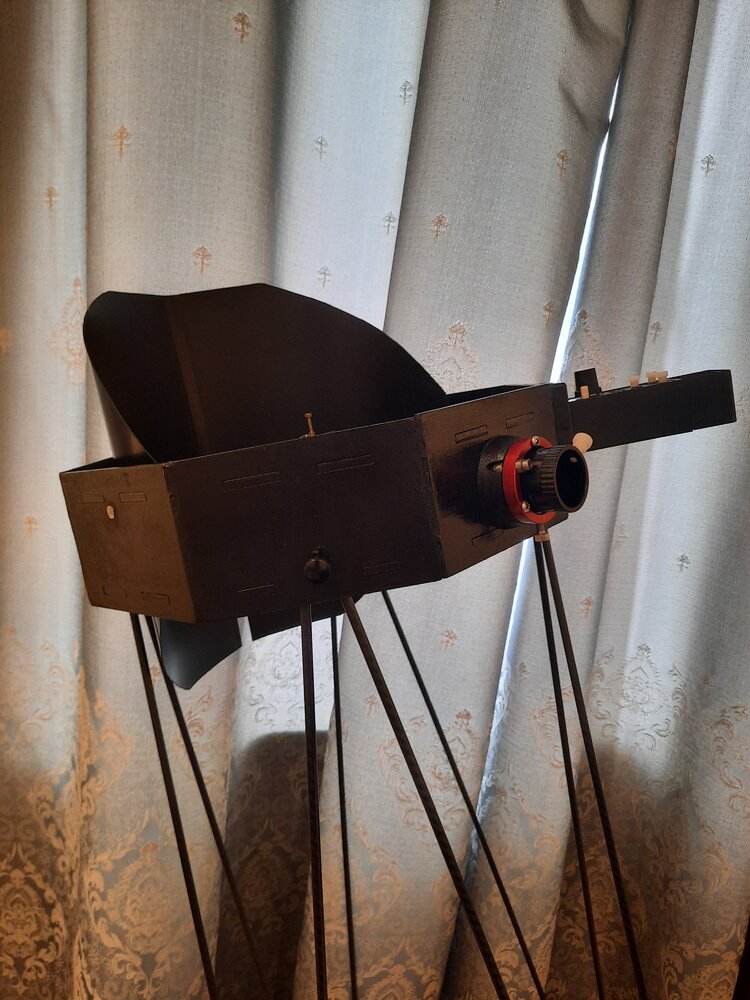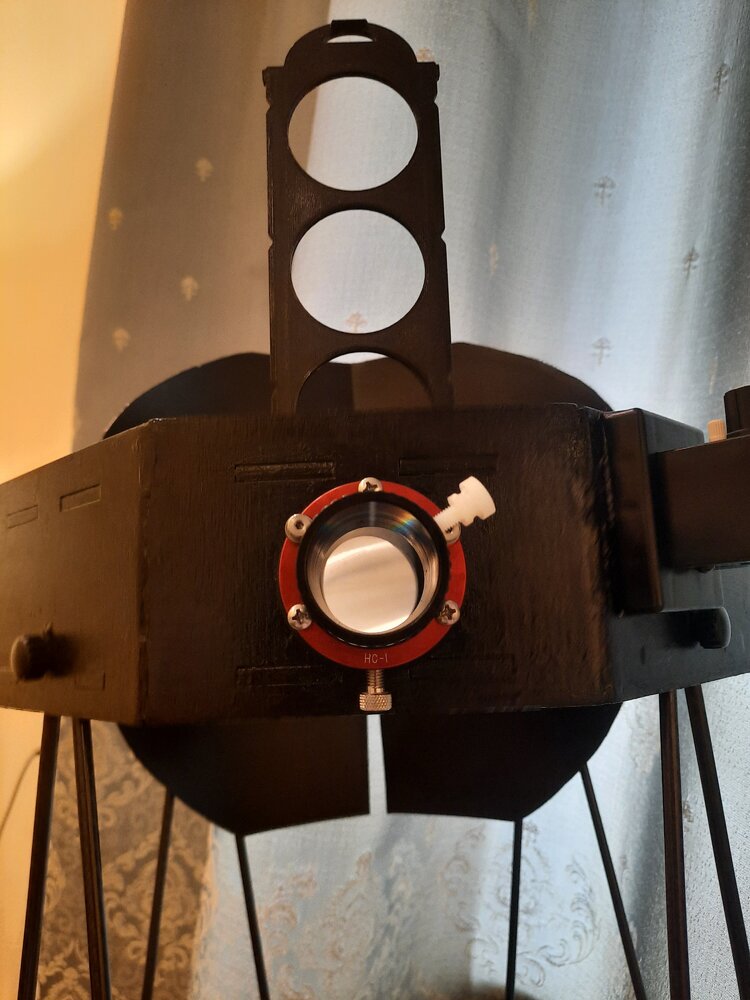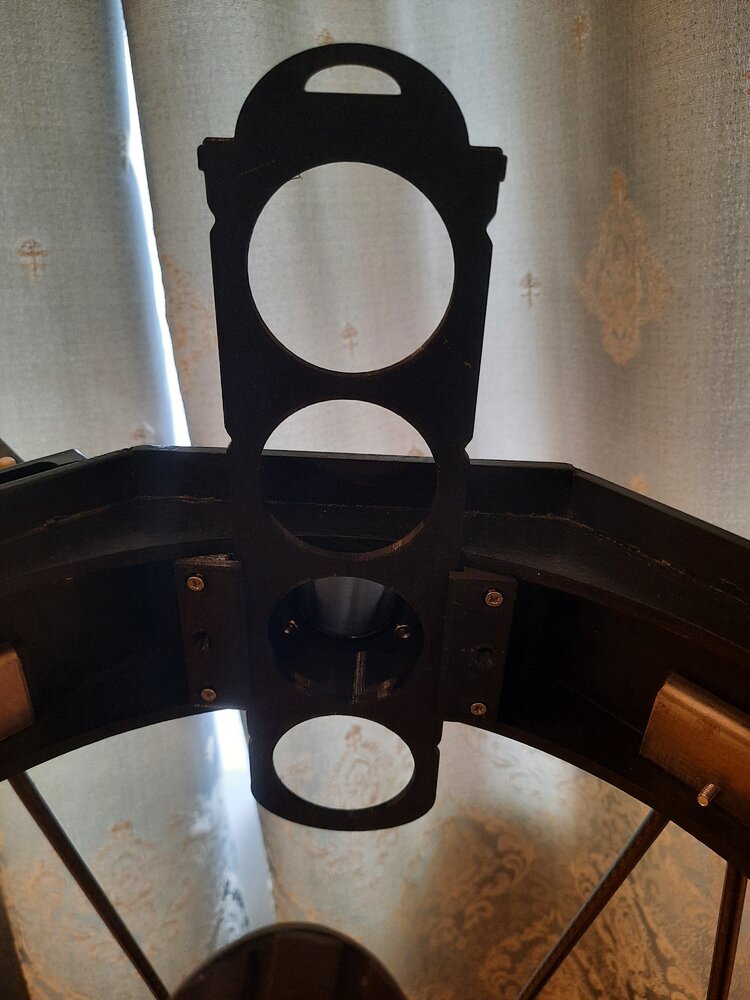 Bonjour à tous, Cela fait un peu plus d'un an que j'ai terminé mon strock, voici quelques améliorations : Le barillet : j'ai remplacé les 2 barres du barillet qui était en acier plein, avec le temps, les boulons des vis de collimation ne se bloquer plus et si je dévissais trop, elles tombaient, ce qui était pénible... donc j'ai profité d'un retour en france pour commander des carrées alus comme sur les plans et c'est parfait maintenant. J'ai également fabriqué un pare lumière, essentiel quand on observe du balcon en ville. J'ai simplement pris une pochette de document en plastique puis coupé pour la faire tenir sur les branches, ça fonctionne très bien. (sur la photo c'était celui d'essai, d'où la petite trace, mais il fait le job donc je l'ai gardé) : -