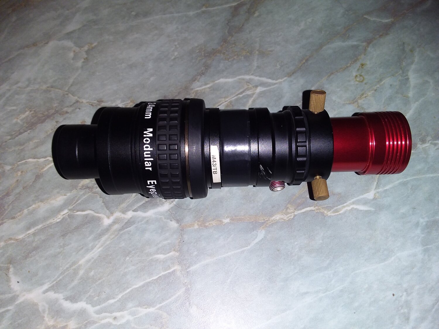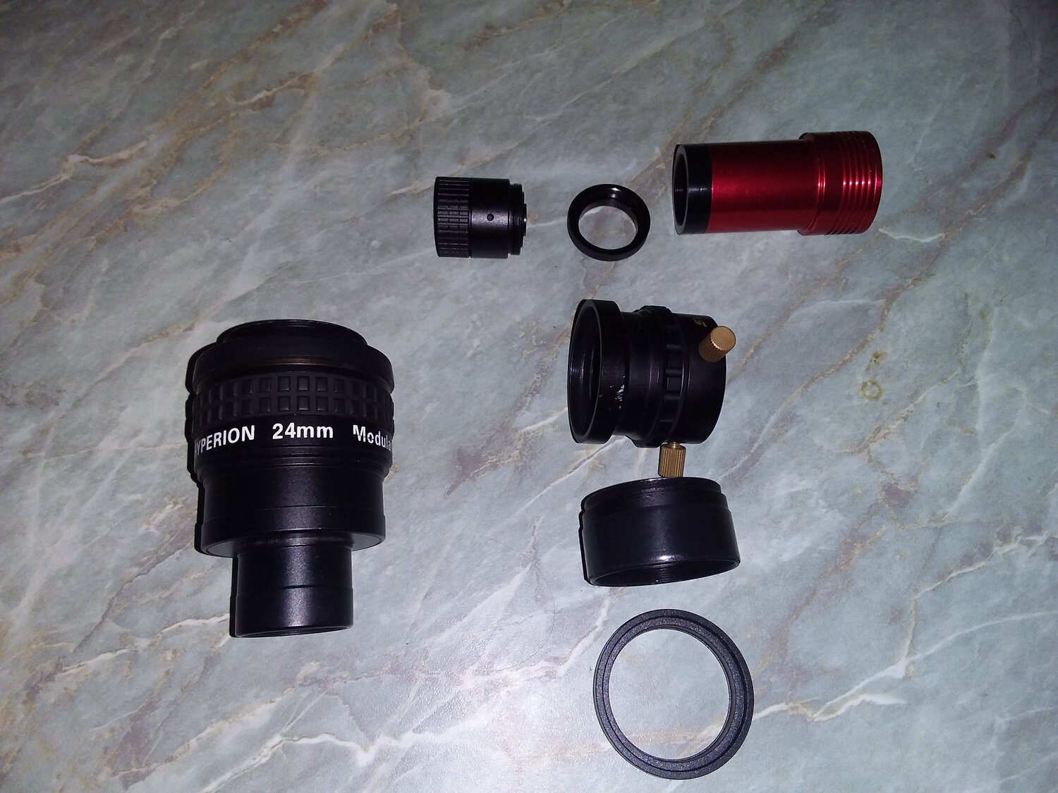 Bonjour à tous aujourd'hui je vous propose de monter un oculaire électronique permettant de faire de la réduction de focale extrême pour aller explorer des cibles en mode Fast and furious. Nous allons pouvoir travailler vers du F1 F2 a moindre frais. Comment ça fonctionne ? Le subterfuge est d'utiliser une méthode dérivée de la vision nocturne l'afocale ou digiscopie mais maîtrisée. Donc un scope un oculaire une caméra astro (de type planétaire) avec un objectif et un p'tit montage. Tout d'abord il faut bien comprendre le principe. F/D du scope multiplié pour la focale de l'objectif le tout divisé par la focale de l'oculaire = F/D RESULTANT. (Juste faire attention à la pupille de sortie) T'inquiètes c'est pas compliqué sachant que l'objectif qui convient le mieux c'est un 8 mm. Prenons un exemple concret avec un tout bête et classique 150/ 750 donc F5. Un oculaire de 24 mm hyperion c'est plus simple et une caméra planétaire compatible c/cs Calculette. F5 x8 = 40 divisé par 24 = focale RESULTANTE F1.6 saperlipopette Imaginons d'autres scénarios Avec un oculaire de 31mm = F 1,29 Avec un oculaire de 40 ben F1😉 Sur le papier c'est quand même sacrément intéressant non? C'est bien beau mais comment on fait? Après pas mal de tests échecs jurons etc voici ce que j'ai pu obtenir mécaniquement. Étant équipé en oculaire hyperion ça tombe bien car c'est la meilleure option possible. Il suffit d'avoir la fameuse bague M43/T2 une rallonge t2 et un porte oculaire. Le tout monté pour version 2 pouces Et voilà pour la partie mécanique. Pour vous convaincre de l'intérêt de la chose je vous invite a consulter le lien suivant. https://www.cloudynights.com/topic/892869-experiment-with-ultra-fast-untracked-eaa/ Prochain dossier ben ce sera des tests et observations 😉 Bon je ne pense pas que ce dossier fasse recette mais les débouchés sont nombreux. Ouki -