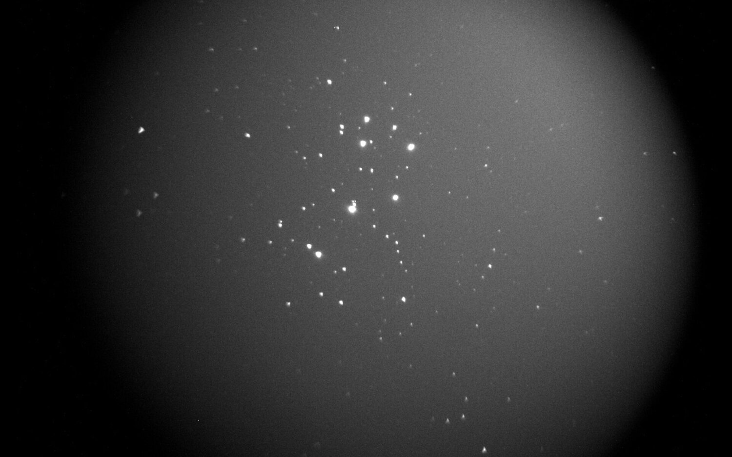 Toute première image réalisée en fast and furious astronomie. Rappel de la formule F/D du scope multiplié pour la focale de l'objectif le tout divisé par la focale de l'oculaire = F/D RESULTANT. (Juste faire attention à la pupille de sortie) J'ai choisi une vario baader 61/250 donc F4,1 Un objectif de 8mm (9€) Un oculaire de 24 mm hyperion Une caméra compatible zwo 178 mm Soit (4,1x8=32) /24 = F/D RESULTANT F 1,36 Monture pied photo, pas de suivi caméra connectée directement à la tablette avec l'application asicap donc pas d'ordinateur, Conditions d'observations exécrables avec voile nuageux pollution soutenue B9 fête foraine annuelle juste dans l'axe Direction M45 car c'est plus facile pour cette première image encore faut t'il la trouver car elle pratiquement invisible dans cette purée de poix de ce jour . Mise au point réglable du gain à 100 je cherche rapido combien de temps d'exposition ben je suis limité a 1 seconde et une seule image Pour comparer je sors les jumelles 7x50 utchhhhh en une seule seconde j'ai clairement plus de détails qu'aux jumelles. Plutôt satisfait au vue des conditions