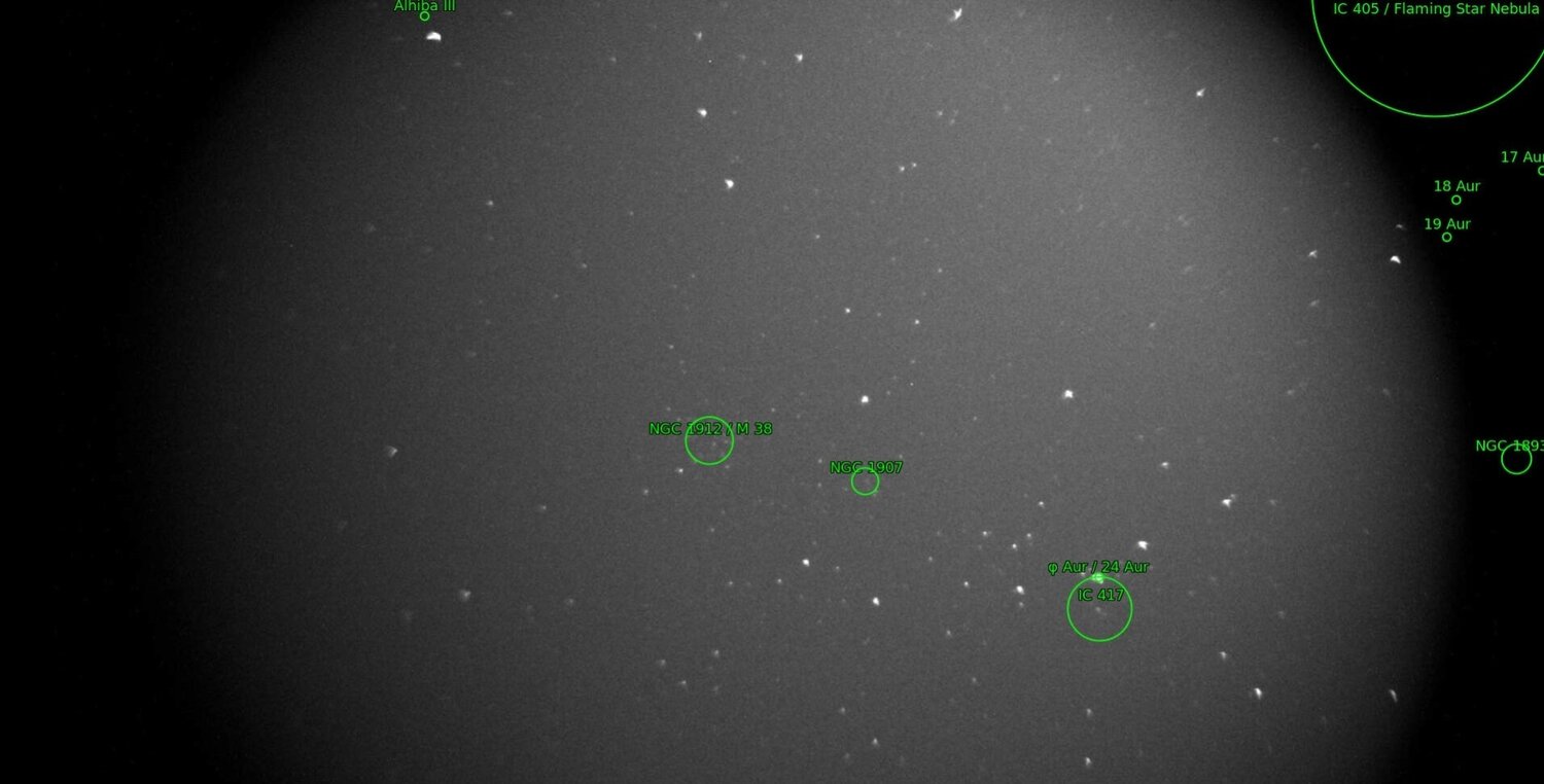 Même soirée Mêmes conditions Même matériel. La couverture nuageuse se renforce il faut vite. Direction le cocher un peu au jugé le telrad est couvert de buée. Shoot rapido Mêmes réglages Vérification aux jumelles je ne verrais rien dans ces conditions. Je plie le matos ca devient impossible. Un petit coup d'astrometrie. Le but était M 37 bingo Vivement de meilleures conditions pour pouvoir exploiter cette extraordinaire technique. Évidemment la suite sera sur monture motorisée avec Empilements. Merci pour votre passage et votre attention. Ouki