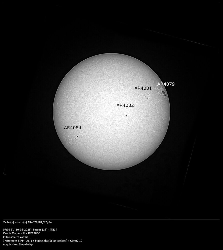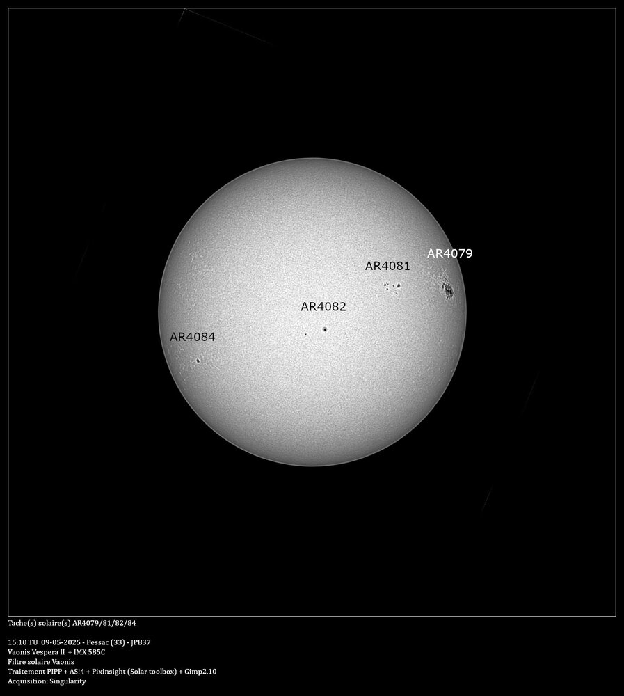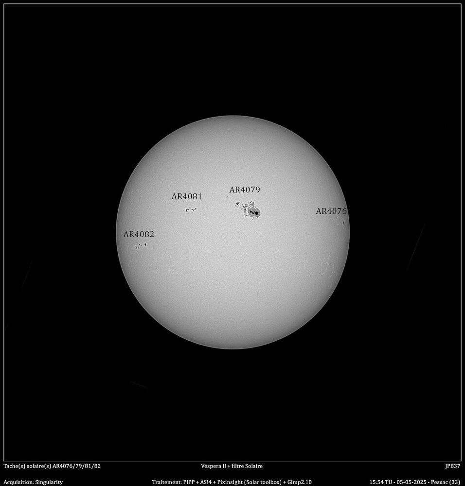 Avant de partir en vacances voici une présentation du suivi d'une tache importante qui c'est présentée fin avril. Je l'ai suivi depuis son apparition sur le limbe gauche le 28/04 jusqu'au 10/05. Au début je pensais qu'elle porterait le numéro 4078, mais le lendemain, elle est apparu sur le site https://www.spac, d'où eweatherlive.com/fr.html sous le numéro 4079, d'où l'erreur sur le première image. J'ai bien sur utilisé le filtre solaire de chez Vaonis. Pour l'observation, c'est instantané, contrairement au ciel profond où il faut cumuler les pauses. Par contre, pour pouvoir en sortir une image, je fais comme conseillé sur le site Vaonis, je laisse les Vespera faire des pauses pendant une dizaine de minutes, puis je l'arrête, je récupère les images avec FileZilla, je les passe dans PIPP pour en sortir une série d'images recadrées en 1200x1200 et en monochrome, puis je les empiles avec AS!4, un traitement avec Pixinsight et la boite à outil solaire, pour finir, le cartouche sous Gimp. Il y a quelques manque dû aux conditions météo qui ne m'ont permis de suivre cette tache tous les jours -