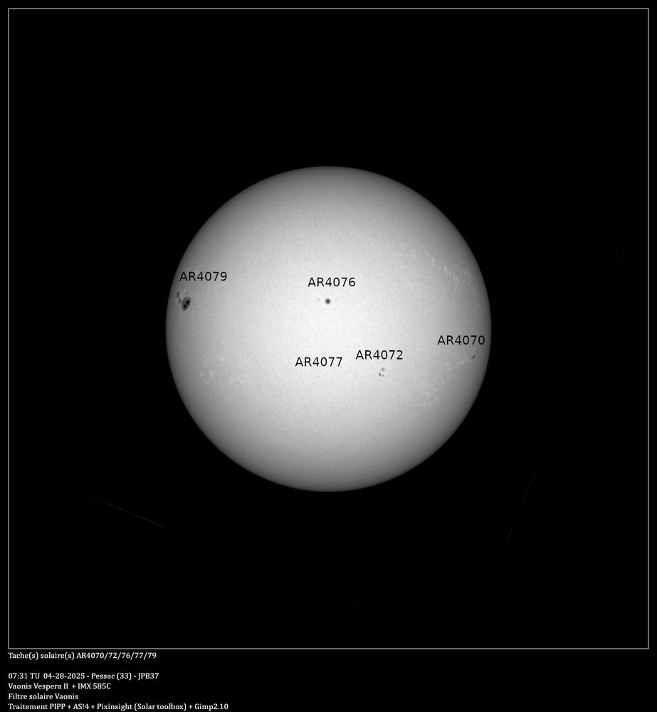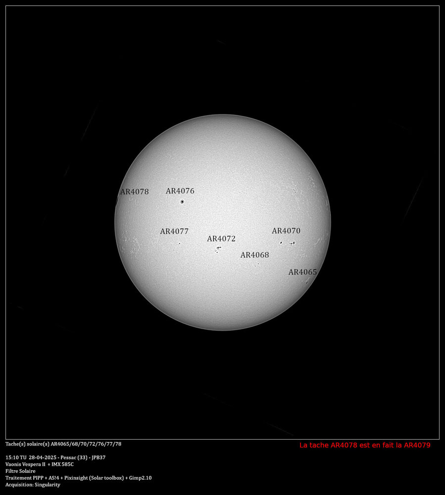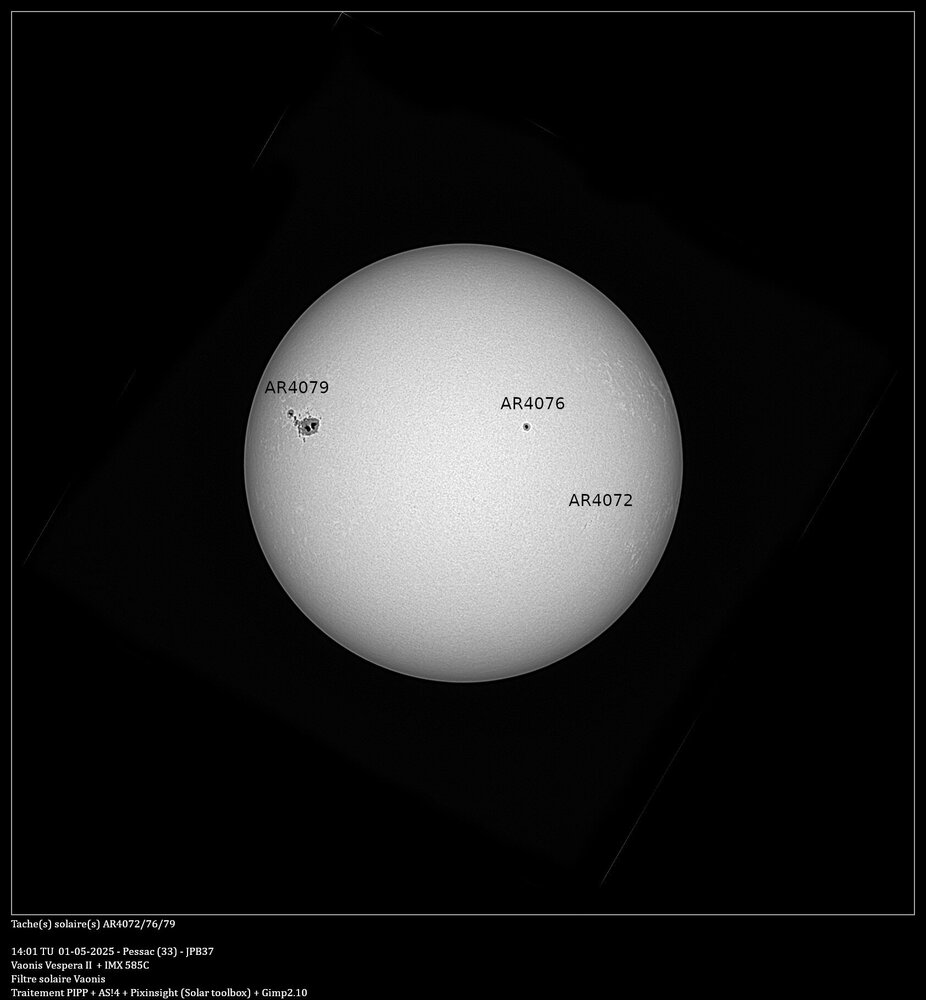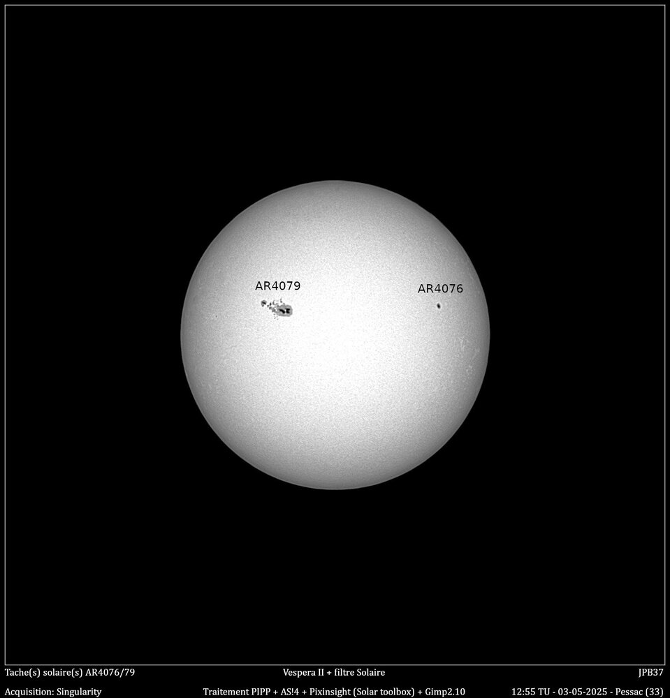 Avant de partir en vacances voici une présentation du suivi d'une tache importante qui c'est présentée fin avril. Je l'ai suivi depuis son apparition sur le limbe gauche le 28/04 jusqu'au 10/05. Au début je pensais qu'elle porterait le numéro 4078, mais le lendemain, elle est apparu sur le site https://www.spac, d'où eweatherlive.com/fr.html sous le numéro 4079, d'où l'erreur sur le première image. J'ai bien sur utilisé le filtre solaire de chez Vaonis. Pour l'observation, c'est instantané, contrairement au ciel profond où il faut cumuler les pauses. Par contre, pour pouvoir en sortir une image, je fais comme conseillé sur le site Vaonis, je laisse les Vespera faire des pauses pendant une dizaine de minutes, puis je l'arrête, je récupère les images avec FileZilla, je les passe dans PIPP pour en sortir une série d'images recadrées en 1200x1200 et en monochrome, puis je les empiles avec AS!4, un traitement avec Pixinsight et la boite à outil solaire, pour finir, le cartouche sous Gimp. Il y a quelques manque dû aux conditions météo qui ne m'ont permis de suivre cette tache tous les jours -