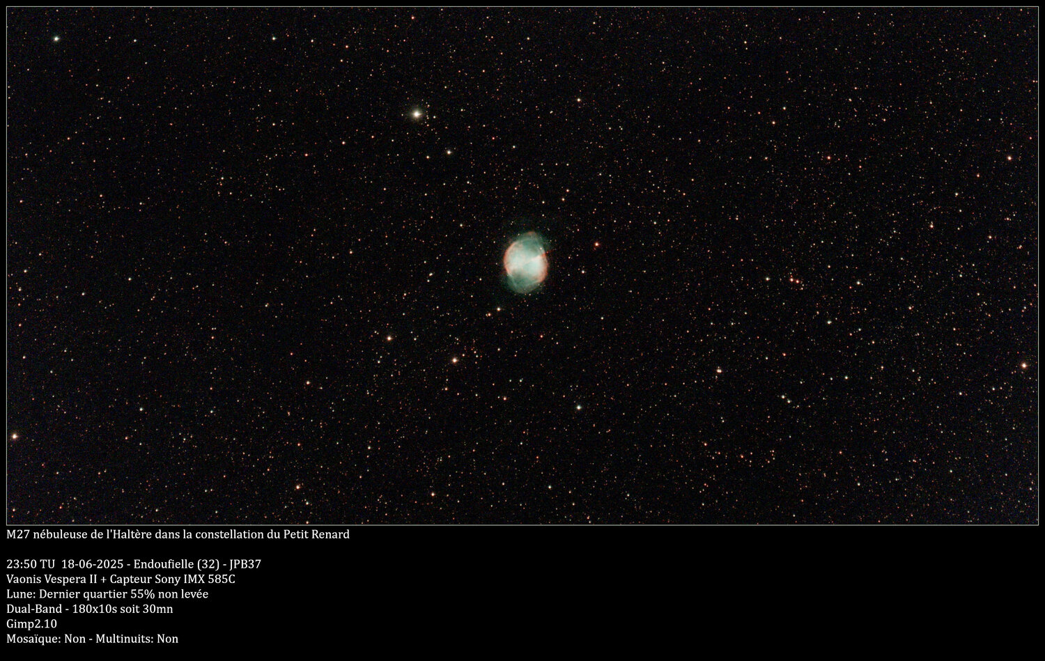 Je continu avec mes observations gersoises, cette fois c'est la nébuleuse de l'Haltère, M27 dans le Petit Renard Objet: M27 nébuleuse de l'Haltère Constellation: Petit Renard Mosaïque: Non Multinuits: Non Date: 18 Juin 2025 Heure: 23h50 Lieu: Endoufielle Images: 180*10s Temps: 30mn Filtre: Dual-Band Humidité: 73% Température: 20° Lune: Dernier quartier 55% non levée Traitement: Gimp 2.10 La nébuleuse de l'Haltère (M27 ou NGC 6853) est une nébuleuse planétaire située dans la constellation du Petit Renard à environ 1 250 années-lumière du système solaire. M27 a été découverte par l'astronome français Charles Messier en 1764. Sa magnitude de 7,4 empêche son observation à l'œil nu, mais avec des jumelles 10 × 50 et de bonnes conditions météo, on peut espérer voir M27. À partir d'un télescope de 150 ou 200 mm, on obtient plus facilement le brillant « trognon ». Il est encore trop tôt pour espérer voir l'étoile centrale (qui ne se dévoilera qu'en photographie à ce niveau). Avec un 300 mm, muni d'un filtre interférentiel de type OIII (recommandé pour l'observation de nébuleuses planétaire et diffuses), le trognon apparaît nettement et l'étoile centrale peut être envisagée, mais seulement sous un très bon ciel, sans pollution parasite, sans turbulence (l'appareil doit être à température) : l'utilisation de la vision décalée permet de mieux voir cette naine blanche. Toutefois, sous un ciel de très haute qualité (dans le Quercy, en haute montagne, en Drôme provençale) plusieurs astronomes amateurs ont observé cette étoile centrale dans des télescopes de 250 mm. Elle est observable entre mai et septembre environ. Elle se situe dans la constellation du Petit Renard, soit en plein Triangle d'été. M27 est de forme ellipsoïde oblongue ou prolate. Comme bien d'autres nébuleuses planétaires, M27 renferment des nœuds. Sa partie centrale présente un motif de cuspides sombres et brillants associés à des queues sombres. Comme pour NGC 2392 et NGC 7293 (la nébuleuse de l'Hélice), les sommets des nœuds brillants sont des fronts de photo-ionisation. Contenu soumis à la licence CC-BY-SA 4.0. Source : Article Nébuleuse de l'Haltère de Wikipédia en français (auteurs) [