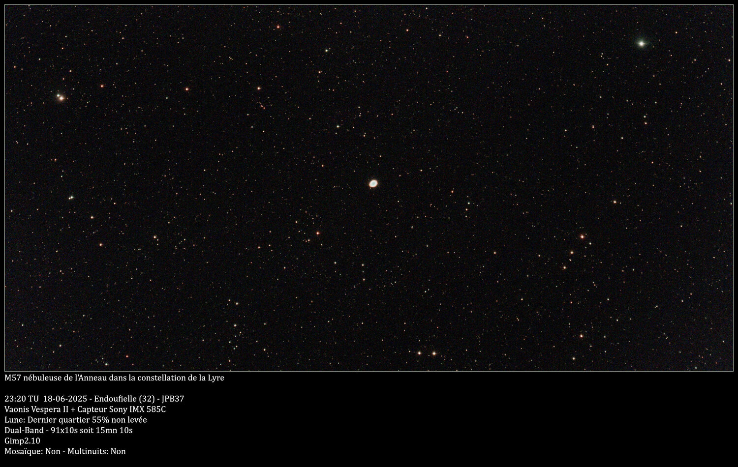 Une autre des observations faites pendant mes vacances gersoises, la nébuleuse de la Lyre, M57, dans la constellation du même nom. Objet: M57 nébuleuse de l'Anneau Constellation: Lyre Mosaïque: Non Multinuits: Non Date: 18 Juin 2025 Heure: 23h20 Lieu: Endoufielle Images: 91*10s Temps: 15mn10s Filtre: Dual-Band Humidité: 73% Température: 21° Lune: Dernier quartier 55% non levée Traitement: Gimp 2.10 Variante des nébuleuse de l'Hélice ou nébuleuse de l'Œil de Chat, située à 2 300 années-lumière de la Terre, cette nébuleuse planétaire du bras d'Orion de la Voie lactée s'est formée au moment de l'évolution stellaire finale de fin de vie de son étoile centrale (similaire au Soleil), qui s'est contractée pour devenir une naine blanche, phase durant laquelle elle s'est débarrassée par expulsions successives de gaz de ses couches externes, pour former ses anneaux lumineux colorés. M57 est découverte par l'astronome français Charles Messier en 1779. Elle est la deuxième nébuleuse planétaire de son catalogue de Messier de 1774, découverte après sa nébuleuse de l'Haltère (M27). Messier était à la recherche de comètes, lorsqu'il a découvert la nébuleuse planétaire le 31 janvier. Le rapport de Messier sur sa découverte indépendante de la comète C/1779 A1 (Bode) est parvenu à l'astronome français Antoine Darquier de Pellepoix deux semaines plus tard et il a alors en cherchant cette comète découvert indépendamment M57. Darquier écrivit plus tard qu'elle était « aussi grande que Jupiter et ressemblait à une planète qui s'estompe », ce qui a sans doute contribué ensuite à l'utilisation de la terminologie persistante de « nébuleuse planétaire ». Comme la plupart des nébuleuses planétaires, M57 est beaucoup plus brillante visuellement avec une magnitude de 8,8 que photographiquement avec une valeur de 9,7. Cela est dû au fait que la plus grande partie de leur lumière est émise dans très peu de raies spectrales. Toutes les parties intérieures de cette nébuleuse ont une teinte bleu-vert causée par les raies d'émission d'oxygène doublement ionisé à 495,7 et 500,7 nm. Les raies spectrales dites interdites se produisent seulement dans des conditions de très basse densité, quelques atomes seulement par centimètre cube. Dans la région externe de l'anneau, une partie de la teinte rougeâtre provient de l'émission à 656,3 nm de l'hydrogène, une des raies de la série de Balmer. Les raies interdites de l'azote contribuent à la teinte rougeâtre à des longueurs d'onde de 654,8 et 658,3 nm. Contenu soumis à la licence CC-BY-SA 4.0. Source : Article Nébuleuse de la Lyre de Wikipédia en français (auteurs)