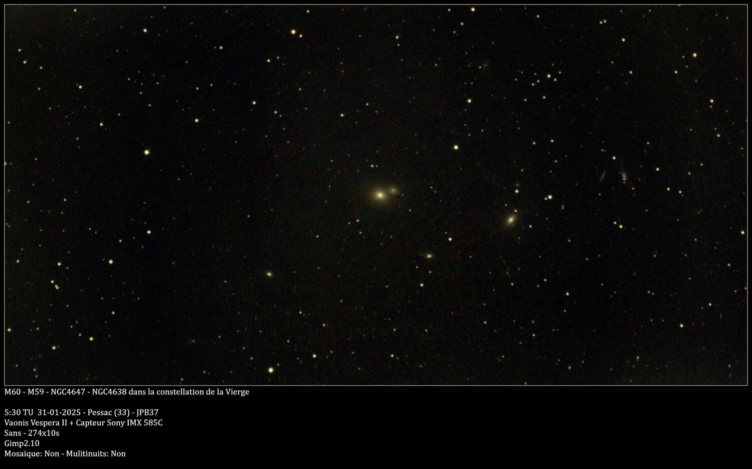 Une observation double, les galaxies elliptiques M59 et M60 dans la constellation de la Vierge Objet: M59 et M60 galaxies elliptiques Constellation: Vierge Mosaïques: Non Multinuits: Non Dates: 31 Janvier 2025 Heure: 6h30mn Lieu: Pessac Images: 274*10s Temps: 45mn 40s Filtre: sans Humidité: 71% Température: 2° Lune: Premier quartier 4% Traitement: Gimp 2.10 NGC 4621 et NGC 4647 sont deux galaxies elliptiques relativement rapprochées situées dans l' amas de galaxies de la constellation de la Vierge, qui en compte 1300. Elle ont été découverte par l'astronome allemand Johann Gottfried Koehler en 1779. Charles Messier les a observé quatre jours après la découverte de Koehler et il les a ajouté à son catalogue sous les numéros 59 et 60. -