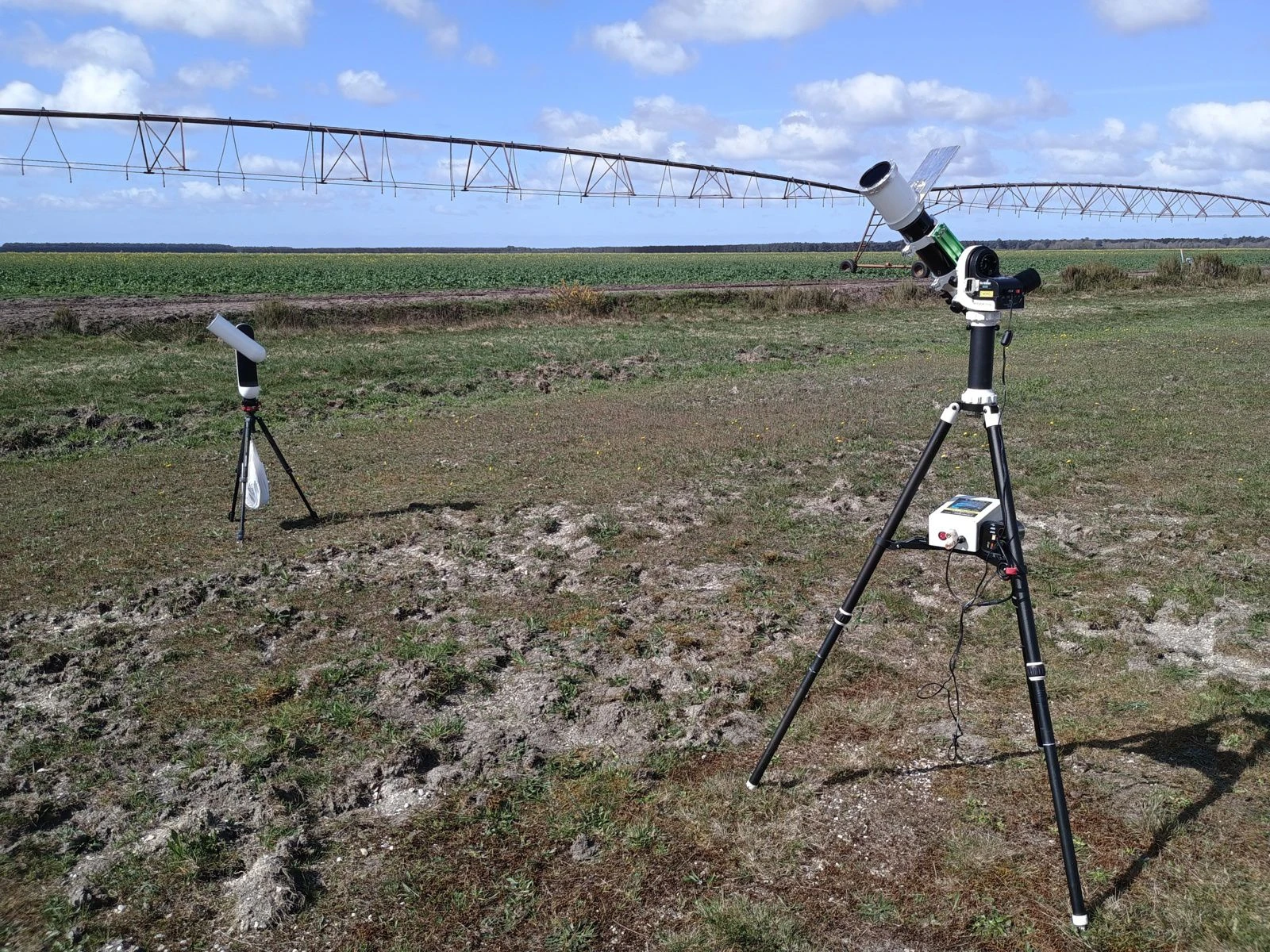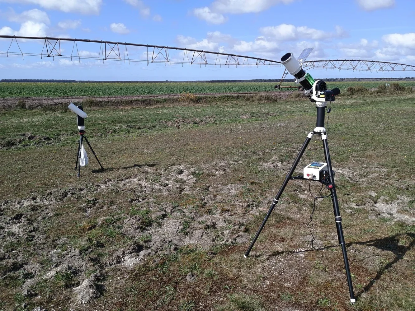 Aucunement, j'ai abandonné l'astrophoto que je pratiquais surtout pendant mes vacances. Trop de matériel à faire suivre et trop de temps passé à traiter les images. Le Vespera II, lui tient dans un petit sac à dos, avec tout le nécessaire dedans, les chargeurs ( tablette et Vespera ), le support de tablette, les filtres solaire et Dual-Band, le niveau, un mini trépied Cullman que j'utilise surtout pour le soleil. Sinon, j'utilise le trépied de l'AZGTI, sur lequel j'ai monté une embase de mise à niveau et une embase rapide en 3/8 de pouce dont la platine reste sous le Vespera à demeure. Cela me permet d'emmener mon matériel quand je vais au club, et de pouvoir lancer des observations en visuel assisté, tandis que l'on observe avec l'un de nos instrument. En général il ne me faut pas plus de 15/20mn entre la mise en œuvre et la première image. Le Vespera sur un autre trépied Cullman au fond, et ma 72ED avec prisme de Herschel lors de l'éclipse du soleil le 29 mars, au club de Cestas. -