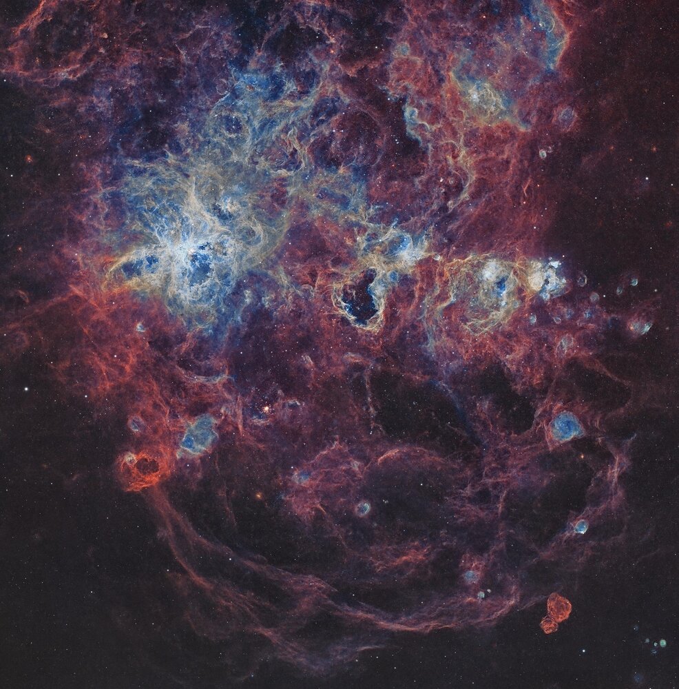 Dans l’esprit de collaboration qui nous anime chez SADR (remote associatif au Chili) voici le résultat de 53h mises en commun sur la Nébuleuse du Poulet qui court, IC2948 dans la constellation du Centaure. Pas mal de détails pour un crop d’une image prise avec une petite lunette de 71mm. 🙂 J’ai taché d’aller chercher des couleurs au-delà du bleu et du orange dans le mixage SHO . Merci aux collaborateurs: Jean-Paul Quéau, Gaëtan Leroy, Alexandre Delarue et Patrick Delay! La full: https://www.astrobin.com/5csge4/