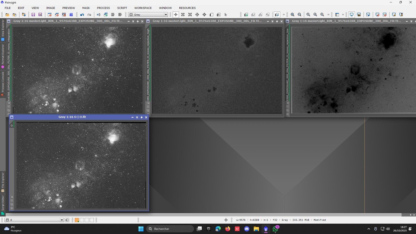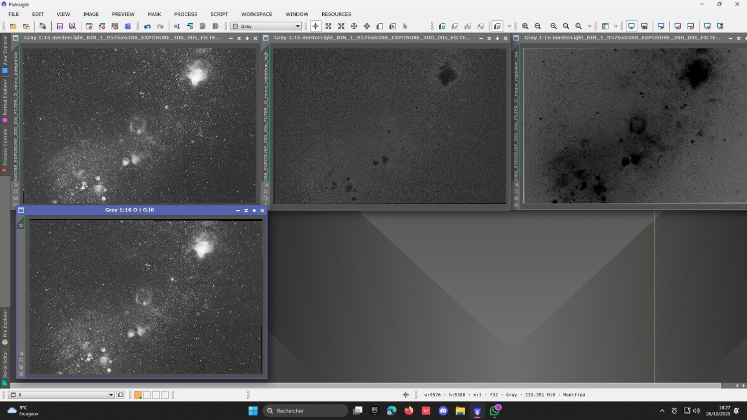 Bonjour, J'utilise aussi WBPP que je connais trop mal. Donc je me permets de vous demander votre aide. Je viens de finir le pré-traitement d'une couche O sur le Petit Nuage de Magellan, avec 89 brutes de 300s. Je remarque deux choses: - le nouveau master O (en haut à gauche) est presque identique à l'ancien issu de seulement 47 brutes (en bas à gauche), alors qu'il y a le double de brutes. Pas normal. - les images "rejection_high" et "rejection low" contiennent bcp d'information, ce qui j'imagine veut dire qu'on perd du signal. Je joins aussi le log de WBPP si cela apporte des infos utiles. Merci et bon ciel! Emmanuel 20251026164126.log